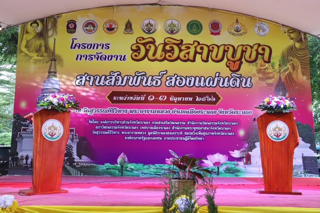 เมื่อเวลา 17.00 น.วันที่ 1 มิ.ย.66 นี้ ที่ วัดสุวรรณคีรีวิหาร พระอารามหลวง อำเภอเมืองระนอง จังหวัดระนอง นายศักระ กปิลกาญจน์ ผู้ว่าราชการจังหวัดระนอง เป็นประธานเปิดงานวันวิสาขบูชาสานสัมพันธ์สองแผ่นดิน ประจำปี 2566 ซึ่งจัดขึ้นโดยองค์การบริหารส่วนจังหวัดระนอง โดยมีพระระณังคมุนีวงศ์ เจ้าคณะจังหวัดระนอง เป็นประธานฝ่ายสงฆ์ กรมส่งเสริมวัฒนธรรม สำนักงานวัฒนธรรมจังหวัดระนอง สภาวัฒนธรรมจังหวัดระนอง เทศบาลเมืองระนอง สำนักงานพระพุทธศาสนาจังหวัดระนอง มูลนิธิระนองสงเคราะห์ ชมรมวิ่งเพื่อสุขภาพจังหวัดระนอง วัดสุวรรณคีรีวิหาร พระอารามหลวง องค์กรภาครัฐและเอกชน รวมทั้งภาคประชาชนผู้มีจิตศรัทธา พุทธศาสนิกชน เข้าร่วมเป็นจำนวนมาก