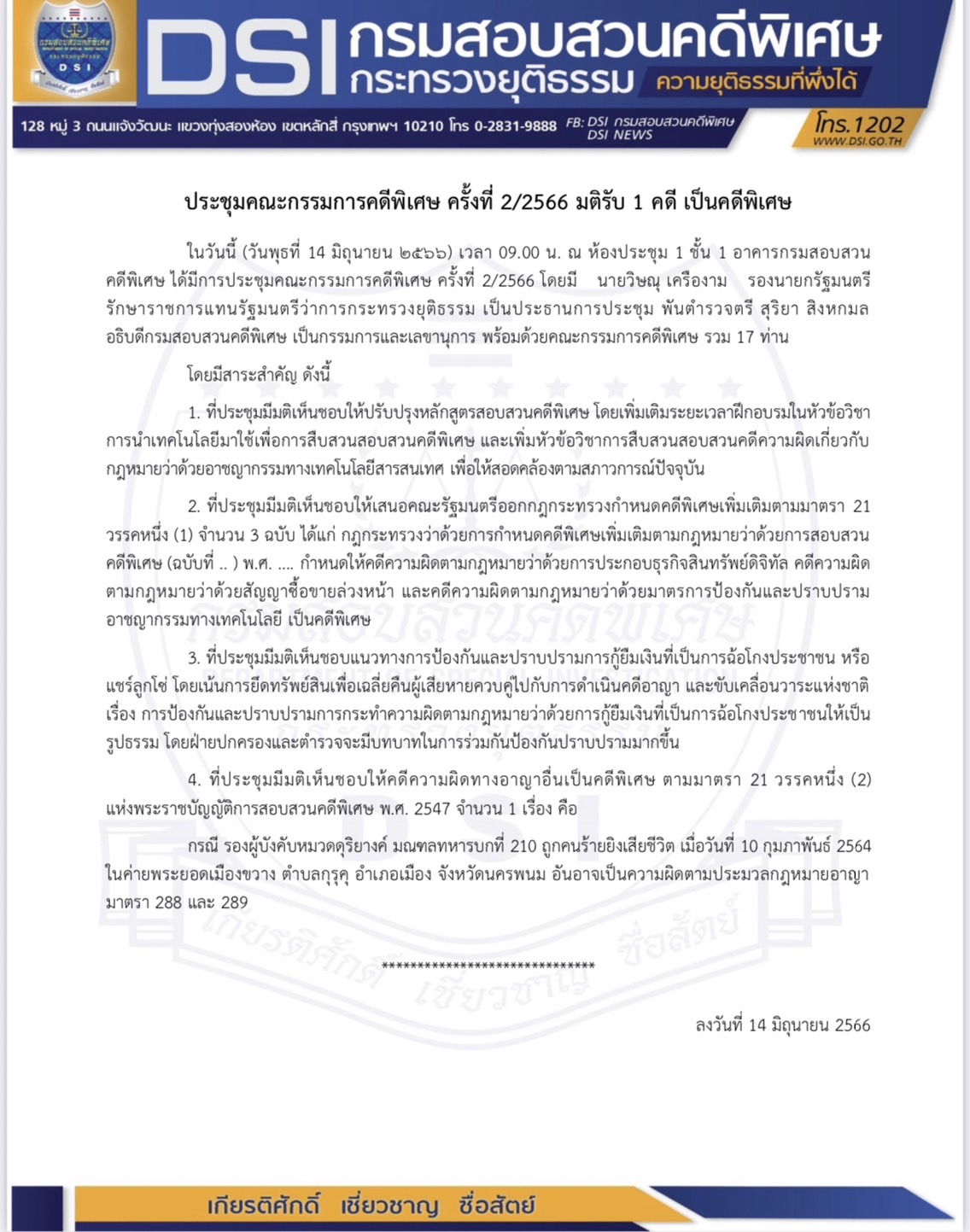 ประชุมคณะกรรมการคดีพิเศษ ครั้งที่ 2/2566 มติรับ 1 คดี เป็นคดีพิเศษ