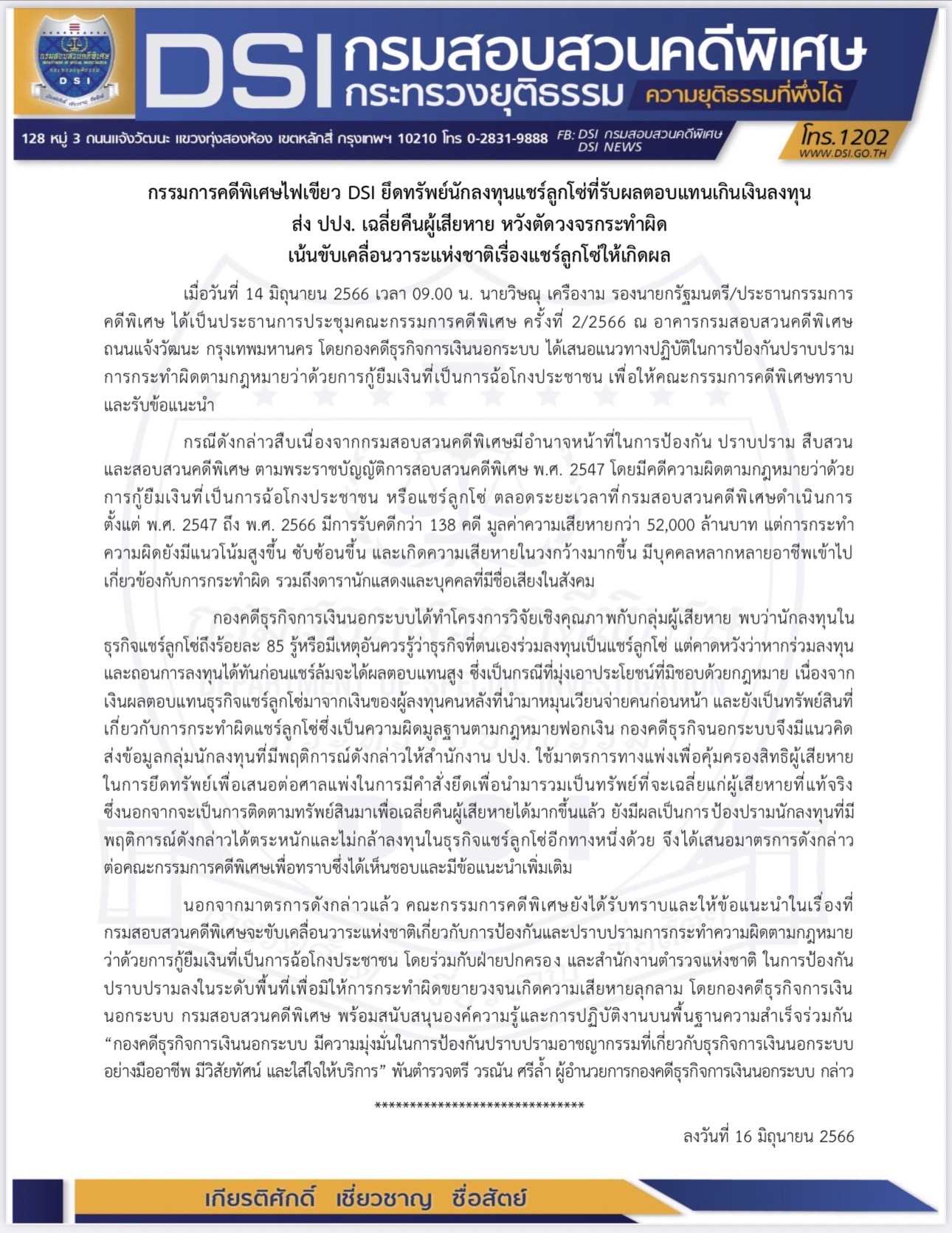 เมื่อวันที่ 14 มิถุนายน 2566 เวลา 09.00 น. นายวิษณุ เครืองาม รองนายกรัฐมนตรี/ประธานกรรมการคดีพิเศษ ได้เป็นประธานการประชุมคณะกรรมการคดีพิเศษ ครั้งที่ 2/2566 ณ อาคารกรมสอบสวนคดีพิเศษ ถนนแจ้งวัฒนะ กรุงเทพมหานคร โดยกองคดีธุรกิจการเงินนอกระบบ ได้เสนอแนวทางปฏิบัติในการป้องกันปราบปรามการกระทำผิดตามกฎหมายว่าด้วยการกู้ยืมเงินที่เป็นการฉ้อโกงประชาชน เพื่อให้คณะกรรมการคดีพิเศษทราบและรับข้อแนะนำ