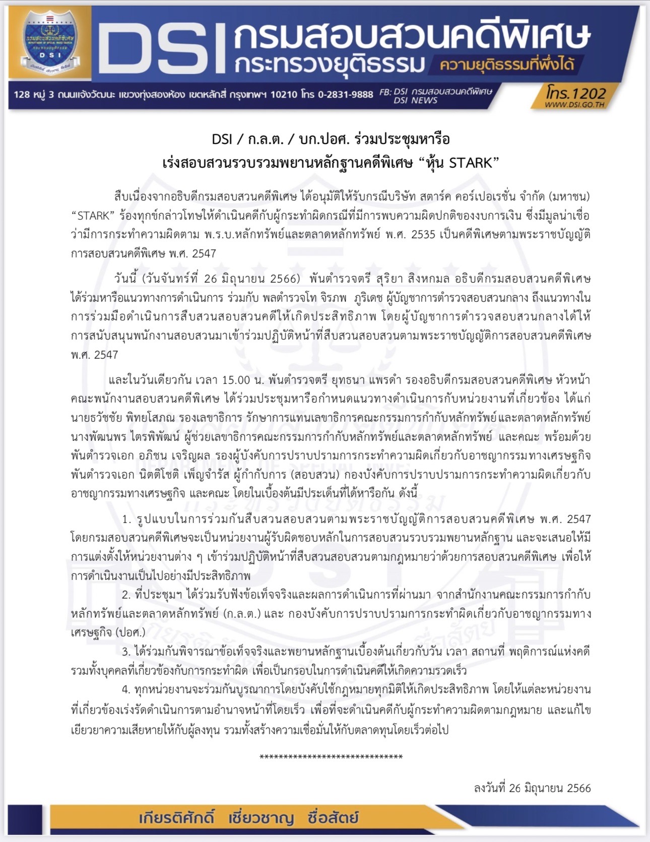 สืบเนื่องจากอธิบดีกรมสอบสวนคดีพิเศษ ได้อนุมัติให้รับกรณีบริษัท สตาร์ค คอร์เปอเรชั่น จำกัด (มหาชน) “STARK” ร้องทุกข์กล่าวโทษให้ดำเนินคดีกับผู้กระทำผิดกรณีที่มีการพบความผิดปกติของงบการเงิน ซึ่งมีมูลน่าเชื่อว่ามีการกระทำความผิดตาม พ.ร.บ.หลักทรัพย์และตลาดหลักทรัพย์ พ.ศ. 2535 เป็นคดีพิเศษตามพระราชบัญญัติการสอบสวนคดีพิเศษ พ.ศ. 2547