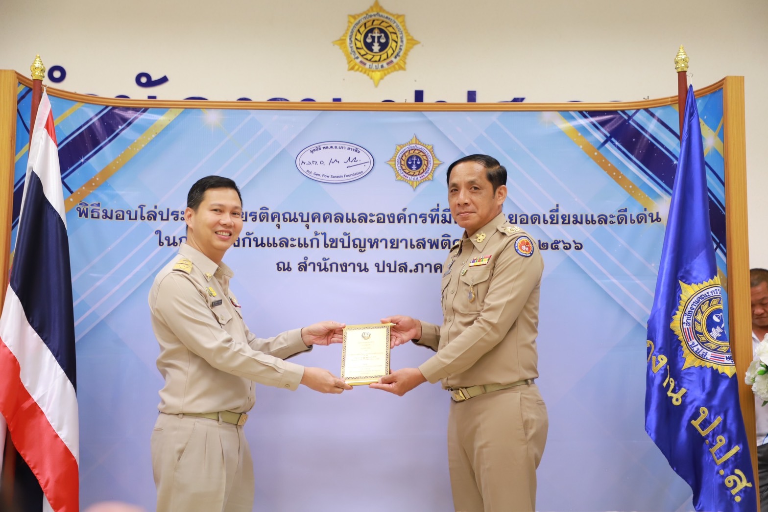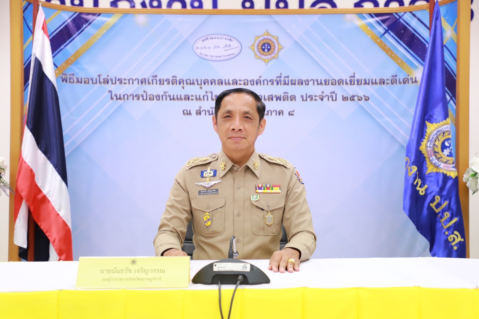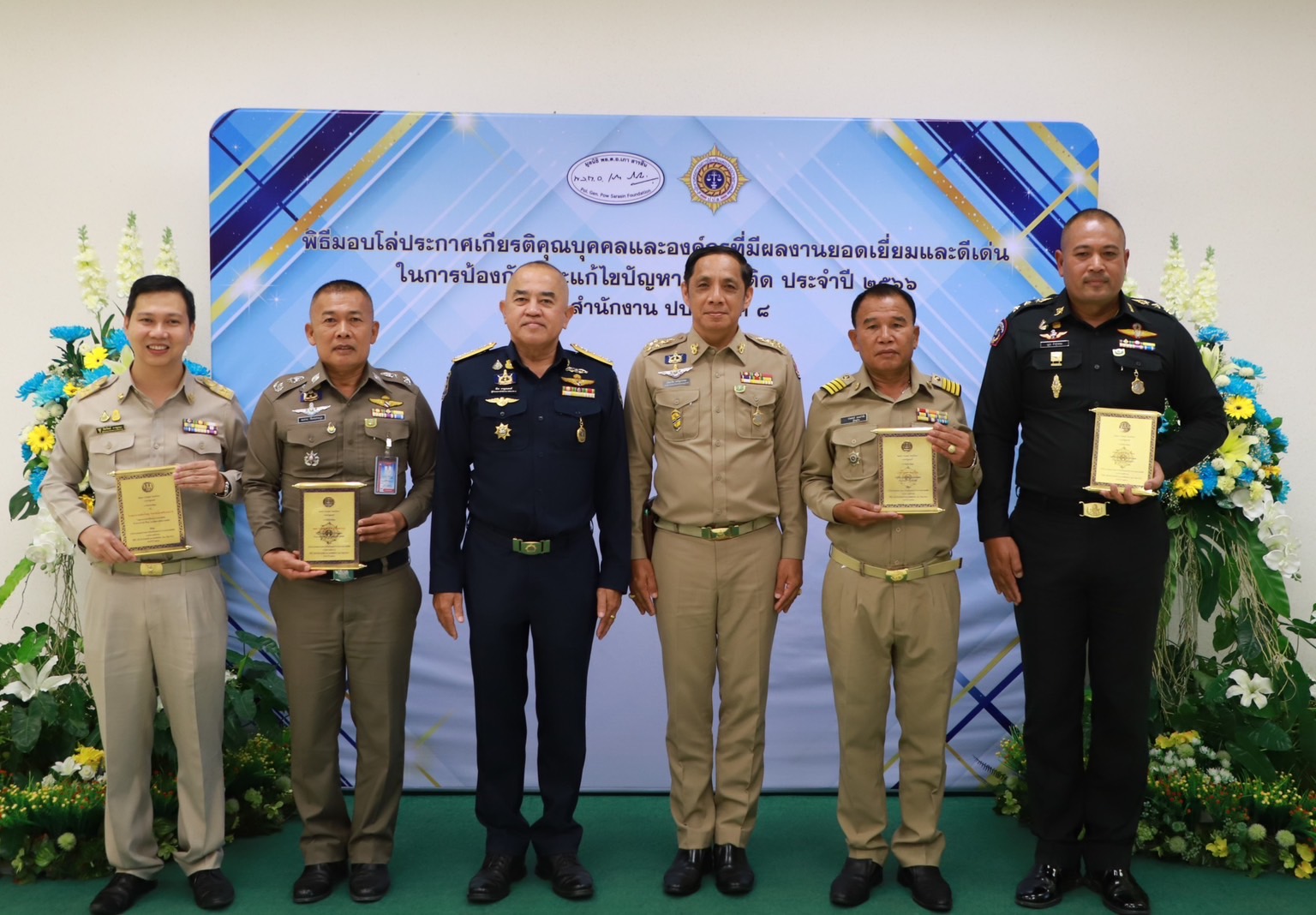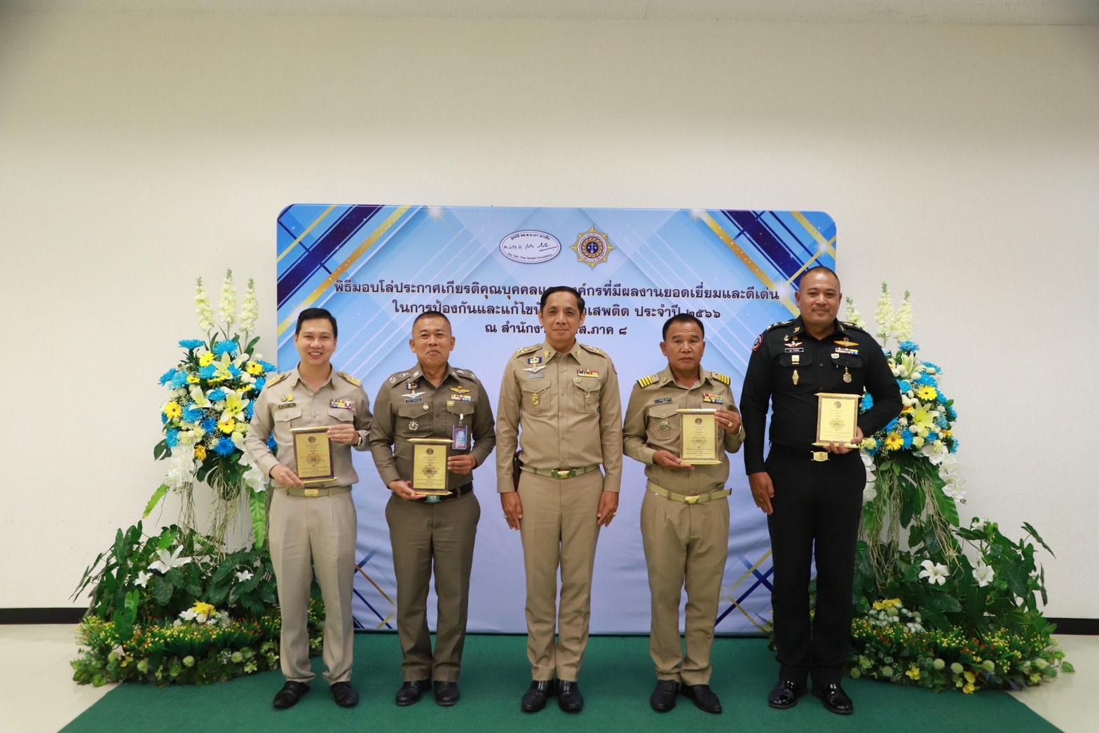 เมื่อวันที่29 มิ.ย. 66 นี้ ณ สำนักงานป้องกันและปราบปรามยาเสพติด ภาค 8 นายวิชวุทย์ จินโต ผู้ว่าราชการจังหวัดสุราษฎร์ธานี มอบหมายให้ นายนันธวัช เจริญวรรณ รองผู้ว่าราชการจังหวัดสุราษฎร์ธานี เป็นประธานในพิธีมอบโล่ประกาศเกียรติคุณบุคคลและองค์กรที่มีผลงานยอดเยี่ยมและดีเด่นในการป้องกันและแก้ไขปัญหายาเสพติด ประจำปี 2566 พร้อมด้วยหน่วยงานภาคีที่เกี่ยวข้อง อัยการ ทหาร ตำรวจ สาธารณสุข เข้าร่วมเป็นเกียรติฯ