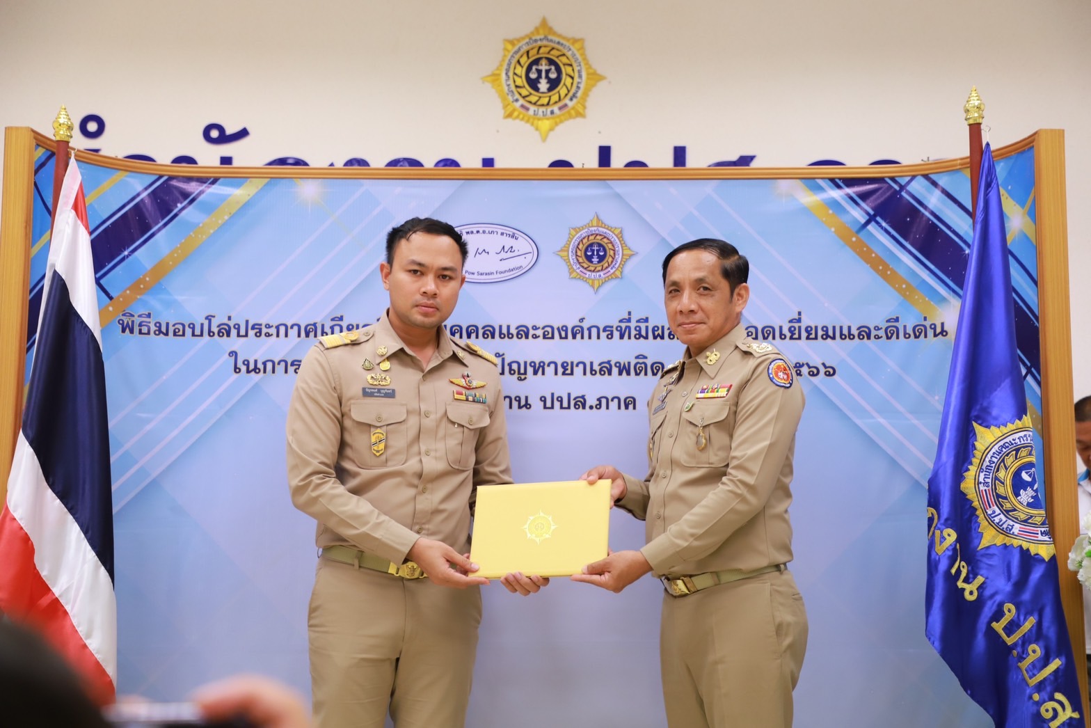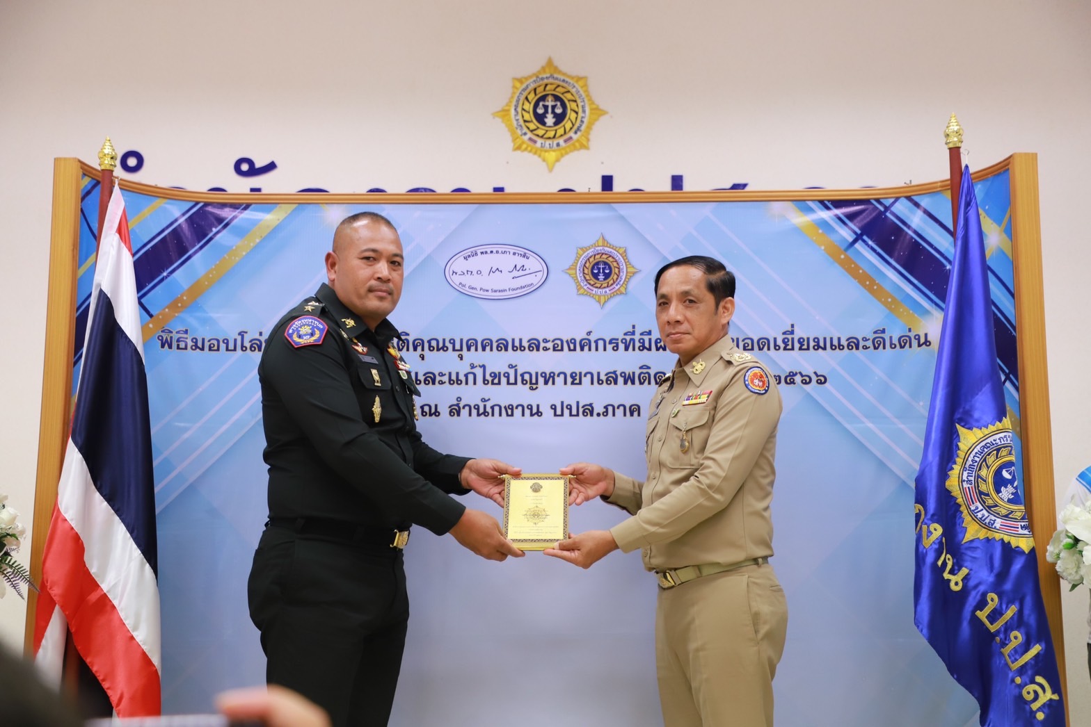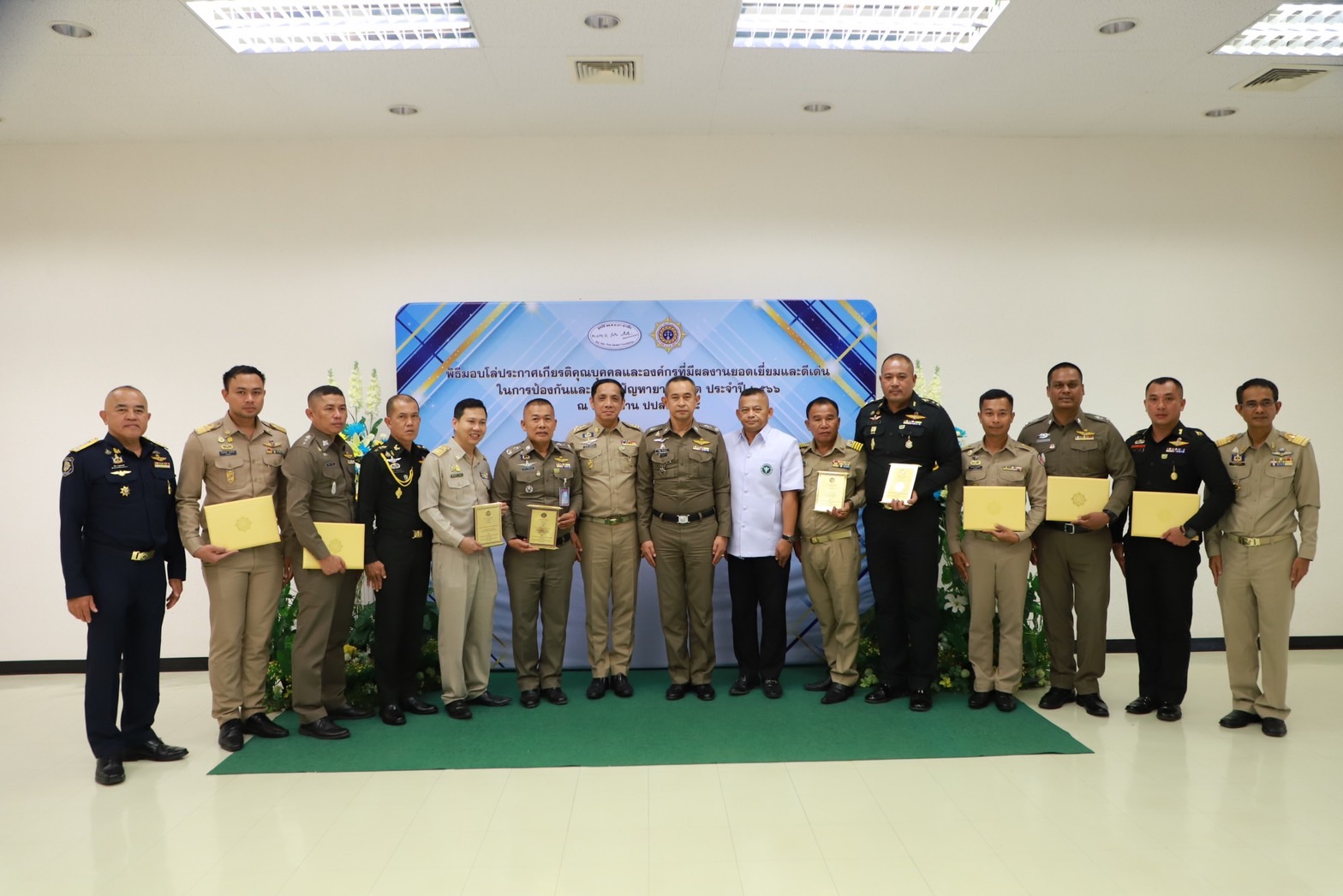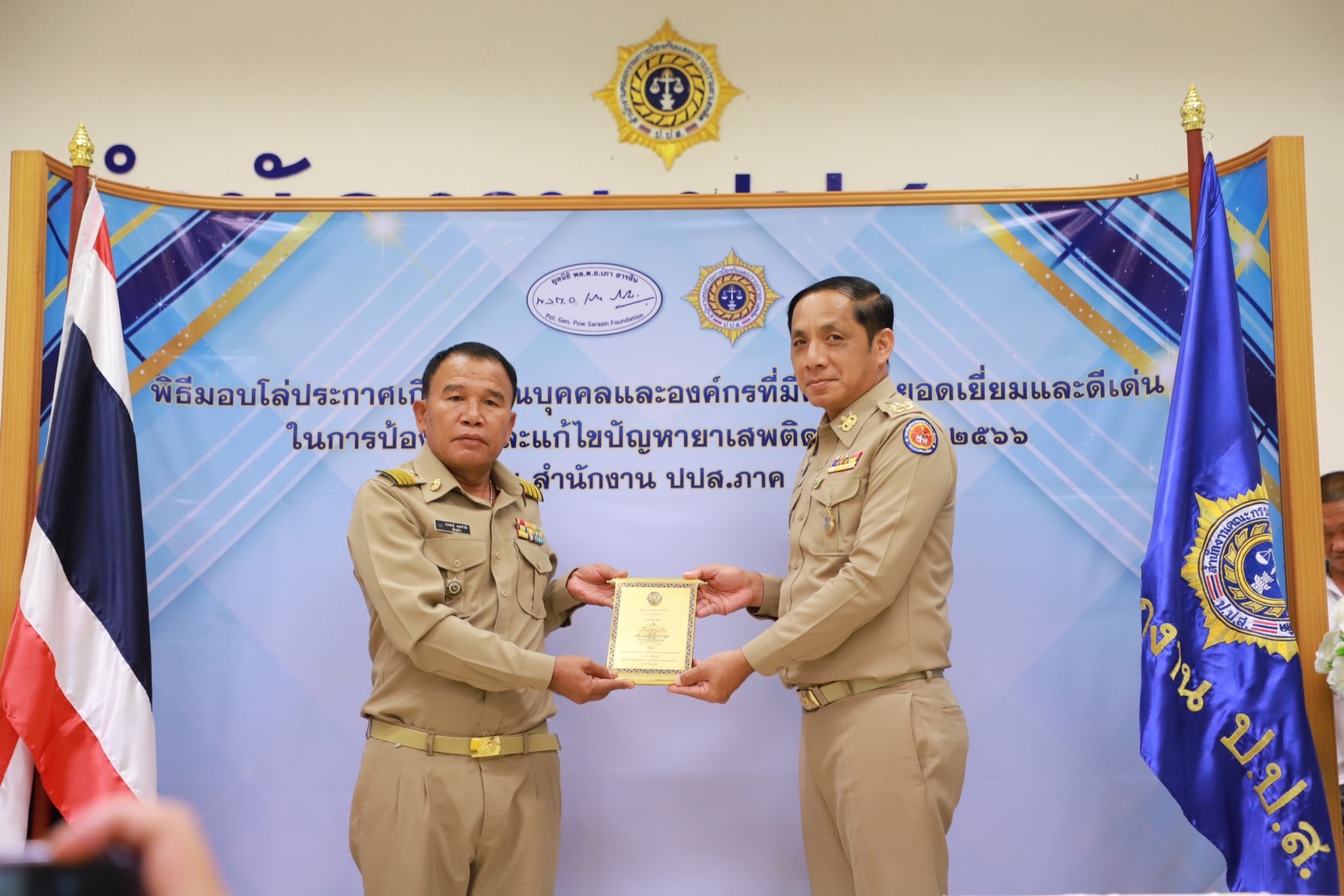 เมื่อวันที่29 มิ.ย. 66 นี้ ณ สำนักงานป้องกันและปราบปรามยาเสพติด ภาค 8 นายวิชวุทย์ จินโต ผู้ว่าราชการจังหวัดสุราษฎร์ธานี มอบหมายให้ นายนันธวัช เจริญวรรณ รองผู้ว่าราชการจังหวัดสุราษฎร์ธานี เป็นประธานในพิธีมอบโล่ประกาศเกียรติคุณบุคคลและองค์กรที่มีผลงานยอดเยี่ยมและดีเด่นในการป้องกันและแก้ไขปัญหายาเสพติด ประจำปี 2566 พร้อมด้วยหน่วยงานภาคีที่เกี่ยวข้อง อัยการ ทหาร ตำรวจ สาธารณสุข เข้าร่วมเป็นเกียรติฯ