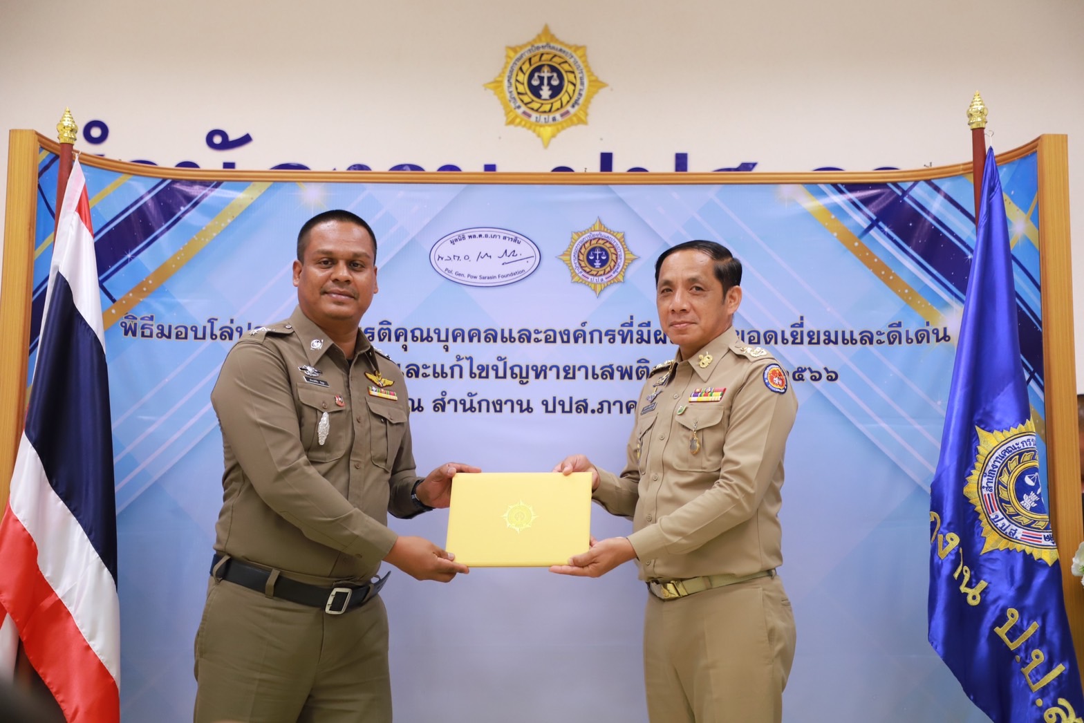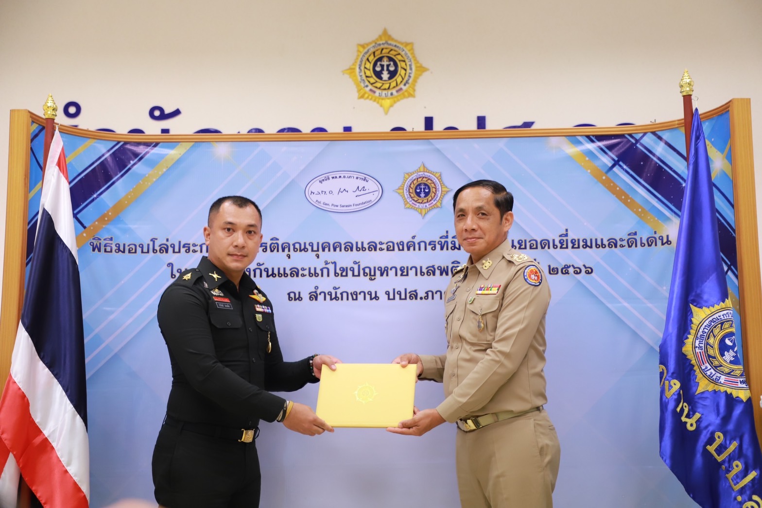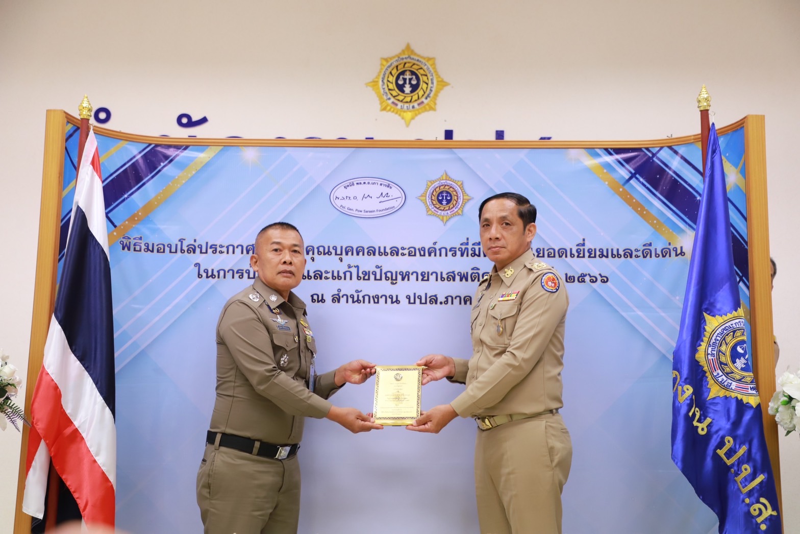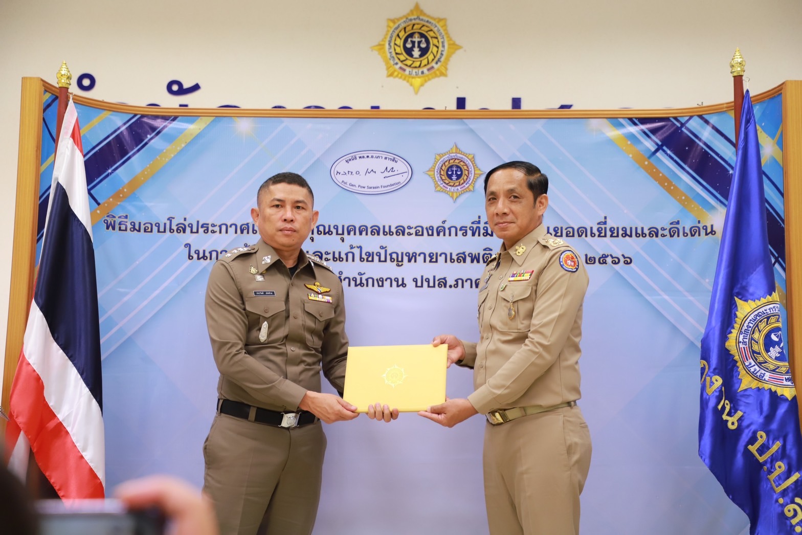 เมื่อวันที่29 มิ.ย. 66 นี้ ณ สำนักงานป้องกันและปราบปรามยาเสพติด ภาค 8 นายวิชวุทย์ จินโต ผู้ว่าราชการจังหวัดสุราษฎร์ธานี มอบหมายให้ นายนันธวัช เจริญวรรณ รองผู้ว่าราชการจังหวัดสุราษฎร์ธานี เป็นประธานในพิธีมอบโล่ประกาศเกียรติคุณบุคคลและองค์กรที่มีผลงานยอดเยี่ยมและดีเด่นในการป้องกันและแก้ไขปัญหายาเสพติด ประจำปี 2566 พร้อมด้วยหน่วยงานภาคีที่เกี่ยวข้อง อัยการ ทหาร ตำรวจ สาธารณสุข เข้าร่วมเป็นเกียรติฯ