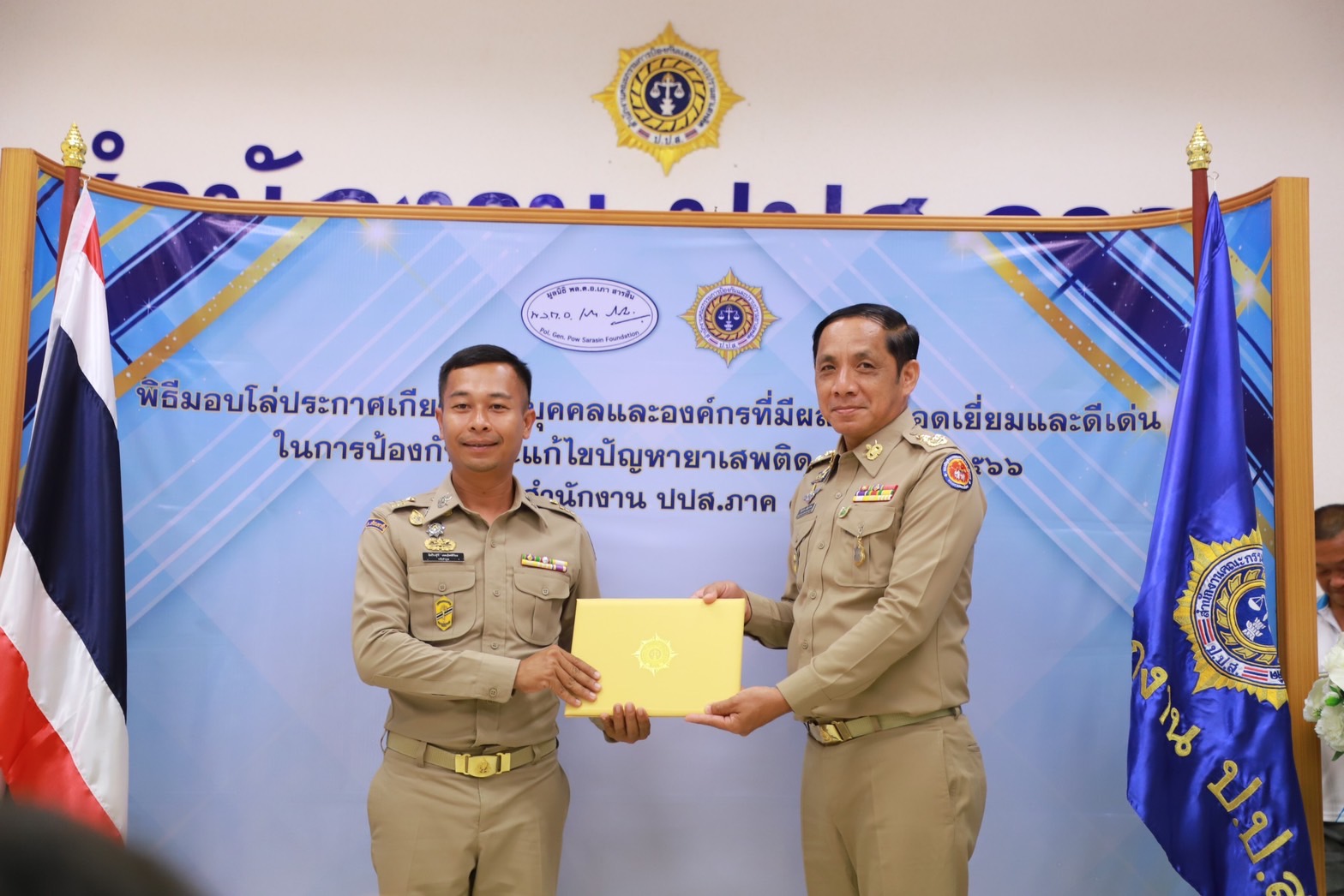 โดยการจัดพิธีมอบโล่เกียรติคุณฯ เป็นหนึ่งในกิจกรรมวันต่อต้านยาเสพติดโลก ซึ่งสำนักงาน ป.ป.ส. ร่วมกับ มูลนิธิ พล.ต.อ.เภา สารสิน ร่วมกันจัดขึ้นมีโดยวัตถุประสงค์เพื่อยกย่องเชิดชูเกียรติ และเป็นขวัญกำลังใจแก่ผู้ปฏิบัติงานที่มีผลงานยอดเยี่ยมและดีเด่นในการป้องกันและแก้ไขปัญหายาเสพติด โดยดำเนินการมาตั้งแต่ปี พ.ศ. 2537 จนถึงปัจจุบัน