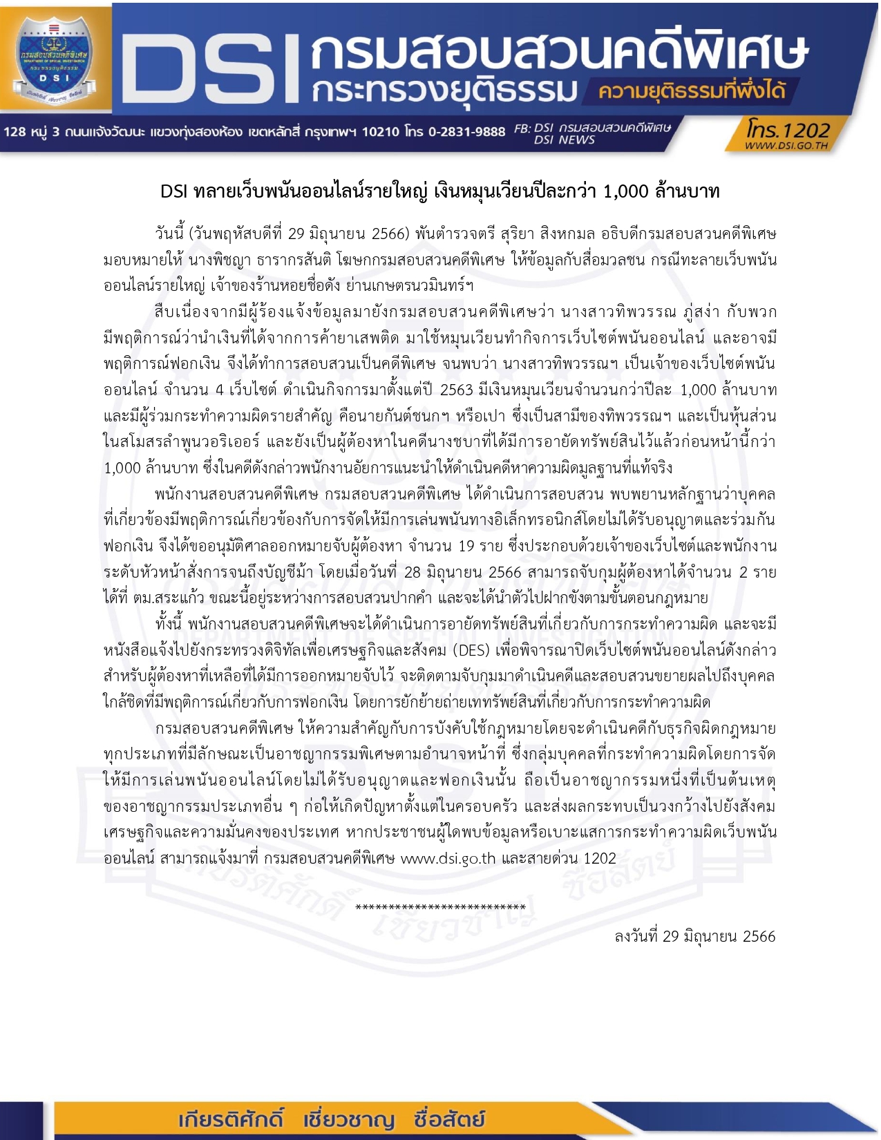กรมสอบสวนคดีพิเศษ ให้ความสำคัญกับการบังคับใช้กฎหมายโดยจะดำเนินคดีกับธุรกิจผิดกฎหมายทุกประเภทที่มีลักษณะเป็นอาชญากรรมพิเศษตามอำนาจหน้าที่ ซึ่งกลุ่มบุคคลที่กระทำความผิดโดยการจัดให้มีการเล่นพนันออนไลน์โดยไม่ได้รับอนุญาตและฟอกเงินนั้น ถือเป็นอาชญากรรมหนึ่งที่เป็นต้นเหตุของอาชญากรรมประเภทอื่น ๆ ก่อให้เกิดปัญหาตั้งแต่ในครอบครัว และส่งผลกระทบเป็นวงกว้างไปยังสังคม เศรษฐกิจและความมั่นคงของประเทศ หากประชาชนผู้ใดพบข้อมูลหรือเบาะแสการกระทำความผิดเว็บพนันออนไลน์ สามารถแจ้งมาที่ กรมสอบสวนคดีพิเศษ www.dsi.go.th และสายด่วน 1202