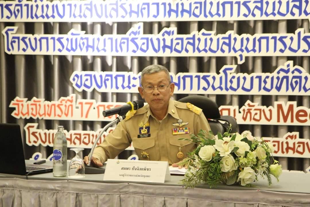 นายสมพร กล่าวว่า สำนักงานคณะกรรมการนโยบายที่ดินแห่งชาติ (สคทช.) ร่วมกับหน่วยงานที่เกี่ยวข้องทั้งส่วนกลางและระดับจังหวัด ได้เร่งรัดขับเคลื่อนนโยบายรัฐบาลและการทำงานเชิงรุกในการบูรณาการการจัดที่ดินทำกินให้ชุมชน เพื่อให้เกิดประโยชน์และประสิทธิภาพสูงสุดแก่ประชาชน โดยมีพระราชบัญญัติคณะกรรมการนโยบายที่ดินแห่งชาติ พ.ศ. 2562 เป็นกฎหมายหลัก และมีคณะกรรมการนโยบายที่ดินแห่งชาติ (คทช.) เป็นกลไกหลักในการกำหนดนโยบายและแผนการบริหารจัดการที่ดินและทรัพยากรดินของประเทศ และมีการแต่งตั้งคณะอนุกรรมการภายใต้ คทช. จำนวน 11 คณะ เป็นกลไกในการขับเคลื่อนนโยบายและแผนดังกล่าว โดยในระดับจังหวัดมีคณะอนุกรรมการนโยบายที่ดินจังหวัด (คทช.จังหวัด) เป็นหน่วยงานในการขับเคลื่อนการจัดที่ดินทำกินให้ชุมชน เนื่องจากมีความใกล้ชิดกับประชาชน และเข้าใจบริบทของพื้นที่ ส่งผลให้เกิดการทำงานที่มีประสิทธิภาพ เกิดประโยชน์แก่ชุมชนที่ได้รับการจัดที่ทำกิน และการดำเนินงานขับเคลื่อนการจัดที่ดินทำกินให้ชุมชน เป็นไปอย่างมีประสิทธิภาพ เกิดประโยชน์สูงสุดแก่ประชาชน มีความจำเป็นที่จะต้องผลักดันการส่งเสริมความร่วมมือในการสนับสนุนการปฏิบัติงาน คทช. เพื่อสนับสนุนการบริหารจัดการที่ดินและทรัพยากรดิน ให้มีความเป็นเอกภาพ เป็นไปในทิศทางเดียวกัน การประชุมในครั้งนี้ เป็นการรับฟังข้อเสนอแนะ ที่เป็นประโยชน์เพิ่มเติม เพื่อให้เกิดประโยชน์สูงสุดและสามารถเป็นแนวทางในการปฏิบัติงาน และความร่วมมือในการสนับสนุนการปฏิบัติงาน คทช.