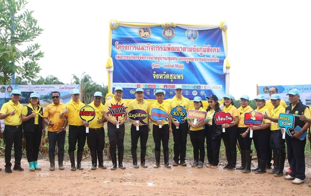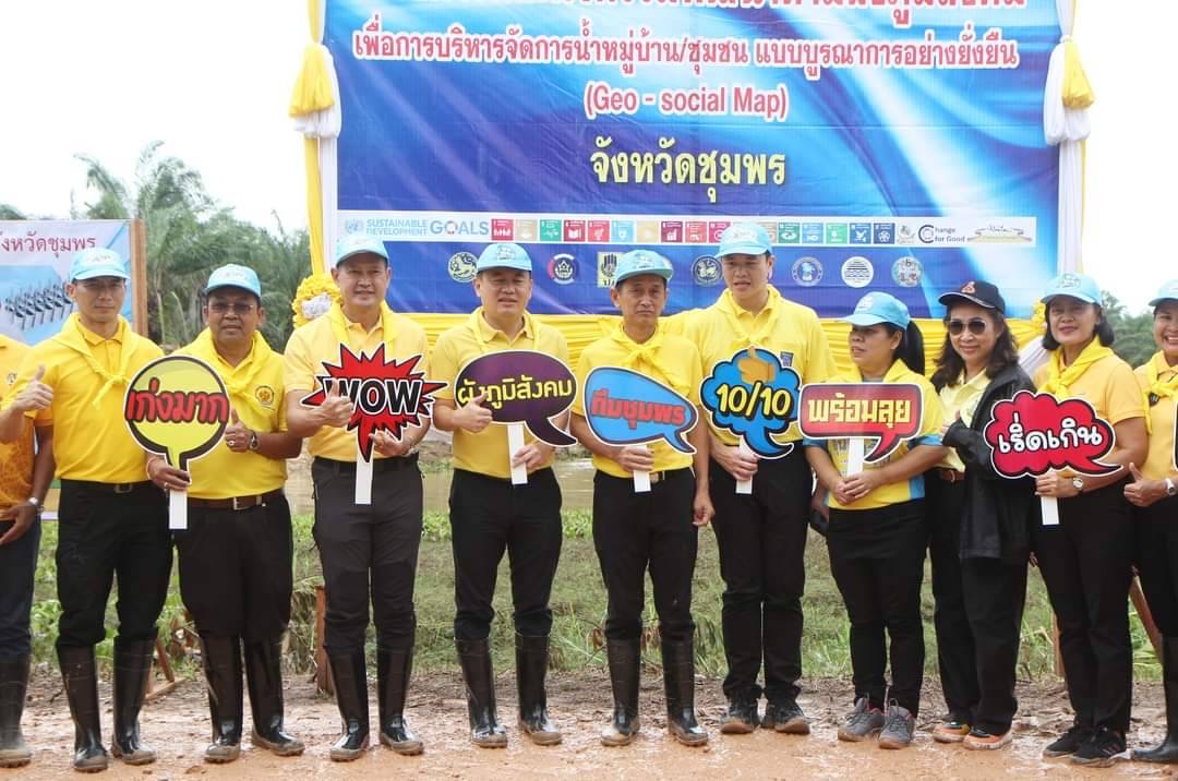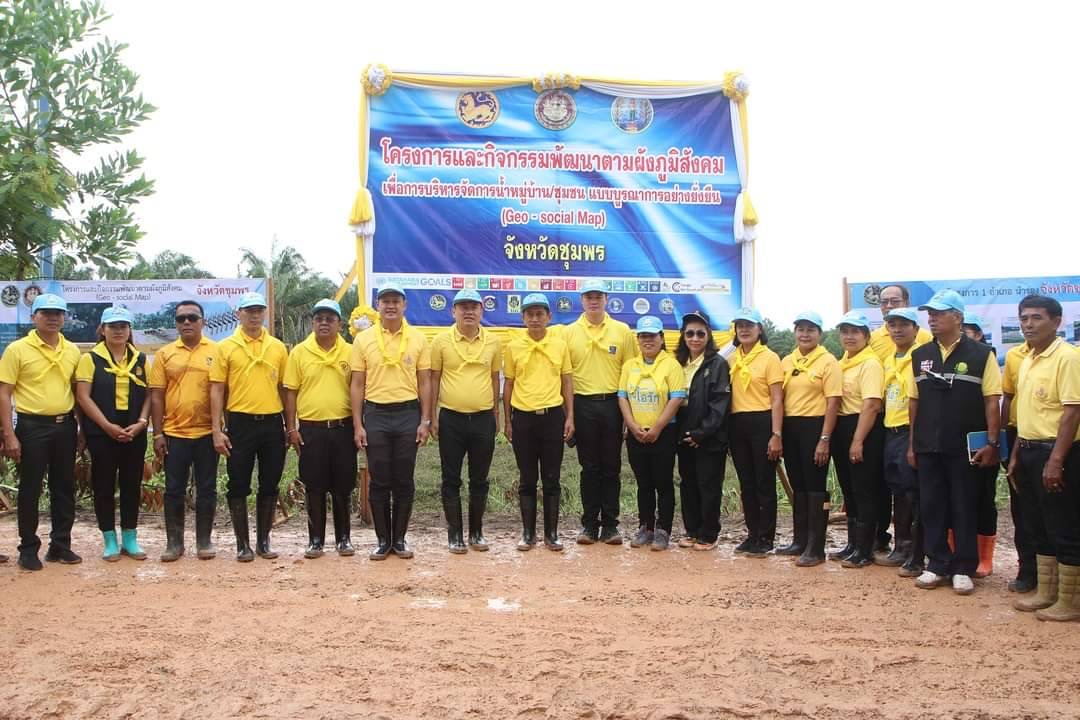 และได้จัดประชุมคณะกรรมการจัดทำผังภูมิสังคม เพื่อการบริหารจัดการน้ำหมู่บ้าน ชุมชน แบบบูรณาการอย่างยั่งยืน จังหวัดชุมพร เพื่อพิจารณาให้ความเห็นชอบโครงการกิจกรรม พัฒนาตามผังภูมิสังคมฯและมอบหมายหน่วยงานรับผิดชอบ ครบทั้ง 8 อำเภอ 70 ตำบลรวมทั้งสิ้น 340 โครงการ จำแนกตามประเภทโครงการ 6 ประเภท คือ โครงการตามแนวพระราชดำริ 94 โครงการ โครงการด้านทรัพยากรน้ำอุปโภคบริโภค 44 โครงการ โครงการด้านทรัพยากรน้ำภาคการผลิต 78 โครงการ โครงการด้านการจัดการปัญหาและการพัฒนาหมู่บ้าน ชุมชน 3 โครงการ โครงการด้านการจัดการน้ำท่วมและอุทกภัย 87 โครงการ โครงการด้านการอนุรักษ์และฟื้นฟูระบบนิเวศทรัพยากรน้ำ 4 โครงการ จำแนกตามขนาดโครงการ 3 ขนาด คือ โครงการขนาดเล็ก (S) ดำเนินการโดยความร่วมมือของภาคีเครือข่ายและจิตอาสา โดยไม่ใช้งบประมาณ จำนวน 2 โครงการ ปัจจุบันดำเนินการแล้วเสร็จแล้ว 1 โครงการ โครงการขนาดกลาง (M) ดำเนินการโดยใช้งบประมาณขององค์กรปกครองส่วนท้องถิ่น จำนวน 230 โครงการ โครงการขนาดใหญ่ (L) ดำเนินการโดยใช้งบประมาณขององค์การบริหารส่วนจังหวัด หรืองบจังหวัด กลุ่มจังหวัด จำนวน 108 โครงการ