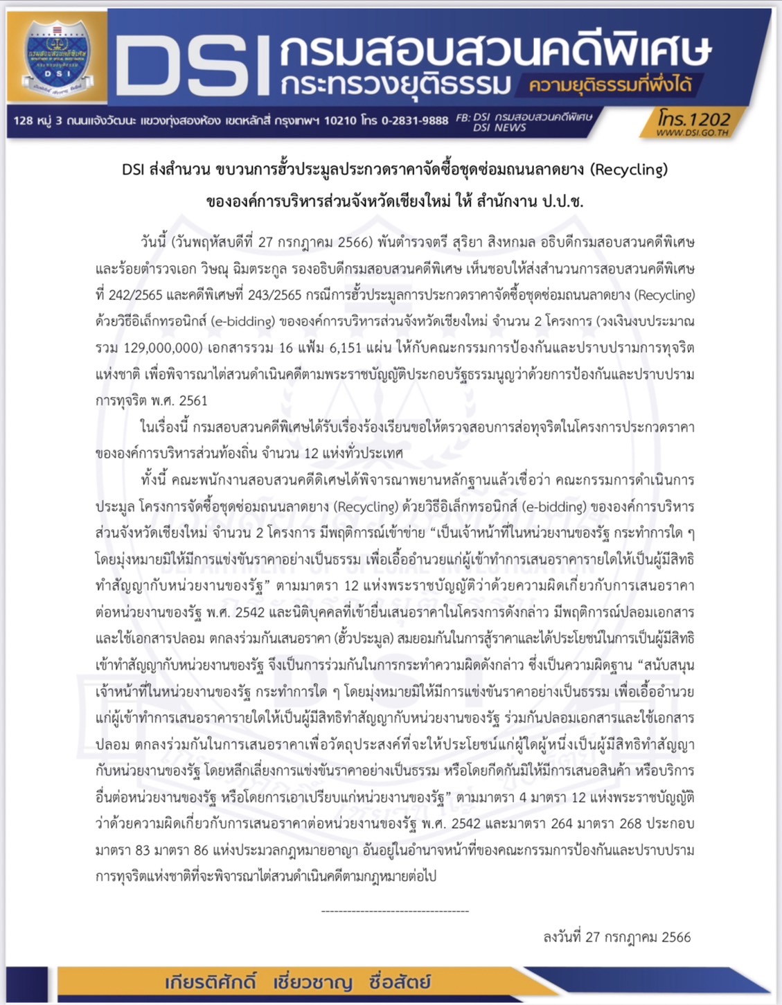 DSI ส่งสำนวน ขบวนการฮั้วประมูลประกวดราคาจัดซื้อชุดซ่อมถนนลาดยาง (Recycling) ขององค์การบริหารส่วนจังหวัดเชียงใหม่ ให้ สำนักงาน ป.ป.ช.