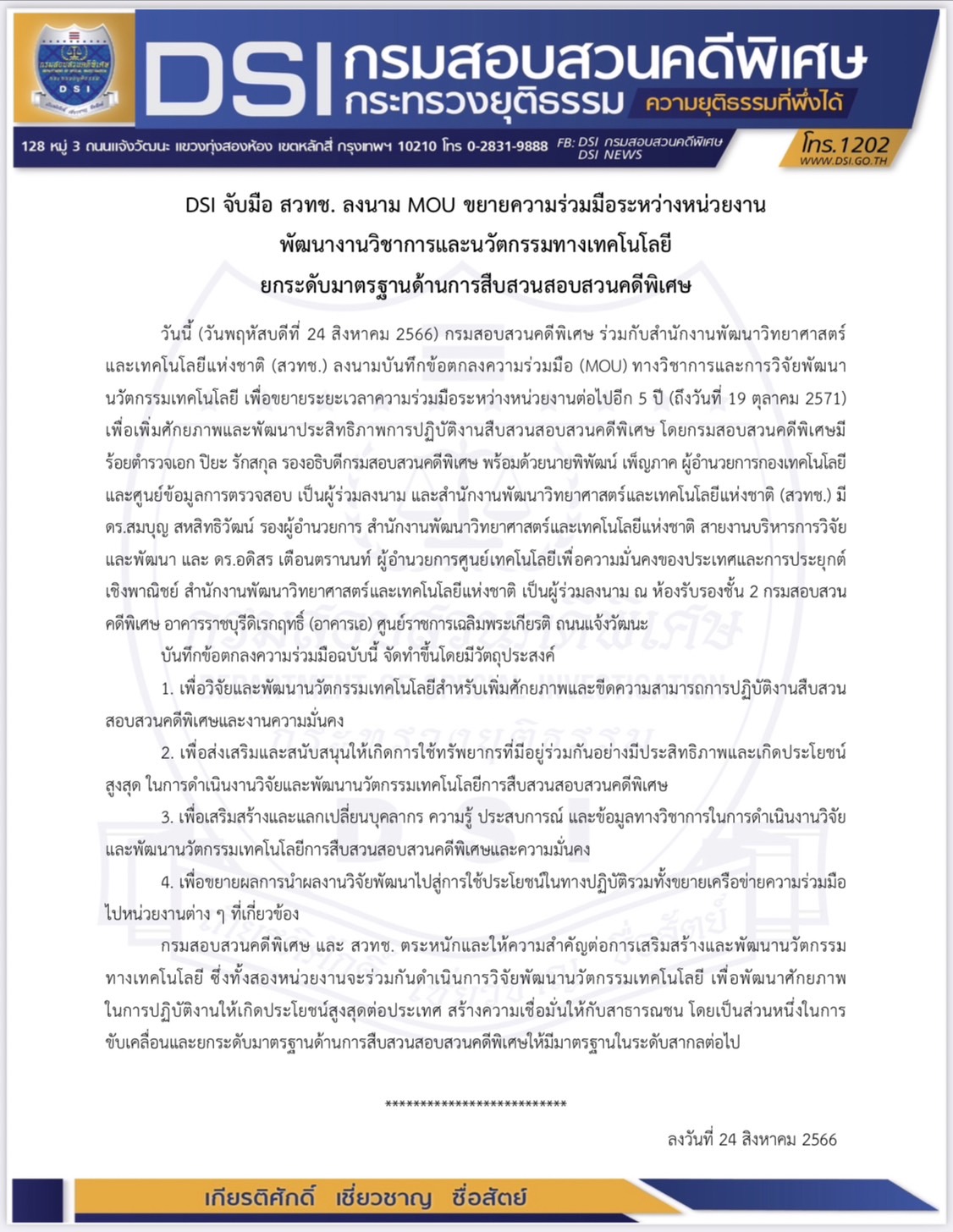 วันนี้ (วันพฤหัสบดีที่ 24 สิงหาคม 2566) กรมสอบสวนคดีพิเศษ ร่วมกับสำนักงานพัฒนาวิทยาศาสตร์และเทคโนโลยีแห่งชาติ (สวทช.) ลงนามบันทึกข้อตกลงความร่วมมือ (MOU) ทางวิชาการและการวิจัยพัฒนานวัตกรรมเทคโนโลยี เพื่อขยายระยะเวลาความร่วมมือระหว่างหน่วยงานต่อไปอีก 5 ปี (ถึงวันที่ 19 ตุลาคม 2571) เพื่อเพิ่มศักยภาพและพัฒนาประสิทธิภาพการปฏิบัติงานสืบสวนสอบสวนคดีพิเศษ โดยกรมสอบสวนคดีพิเศษมี ร้อยตำรวจเอก ปิยะ รักสกุล รองอธิบดีกรมสอบสวนคดีพิเศษ พร้อมด้วยนายพิพัฒน์ เพ็ญภาค ผู้อำนวยการกองเทคโนโลยีและศูนย์ข้อมูลการตรวจสอบ เป็นผู้ร่วมลงนาม และสำนักงานพัฒนาวิทยาศาสตร์และเทคโนโลยีแห่งชาติ (สวทช.) มี ดร.สมบุญ สหสิทธิวัฒน์ รองผู้อำนวยการสำนักงานพัฒนาวิทยาศาสตร์และเทคโนโลยีแห่งชาติ สายงานบริหารการวิจัยและพัฒนา และ ดร.อดิสร เตือนตรานนท์ ผู้อำนวยการศูนย์เทคโนโลยีเพื่อความมั่นคงของประเทศและการประยุกต์เชิงพาณิชย์ สำนักงานพัฒนาวิทยาศาสตร์และเทคโนโลยีแห่งชาติ เป็นผู้ร่วมลงนาม ณ ห้องรับรองชั้น 2 กรมสอบสวนคดีพิเศษ อาคารราชบุรีดิเรกฤทธิ์ (อาคารเอ) ศูนย์ราชการเฉลิมพระเกียรติ ถนนแจ้งวัฒนะ
