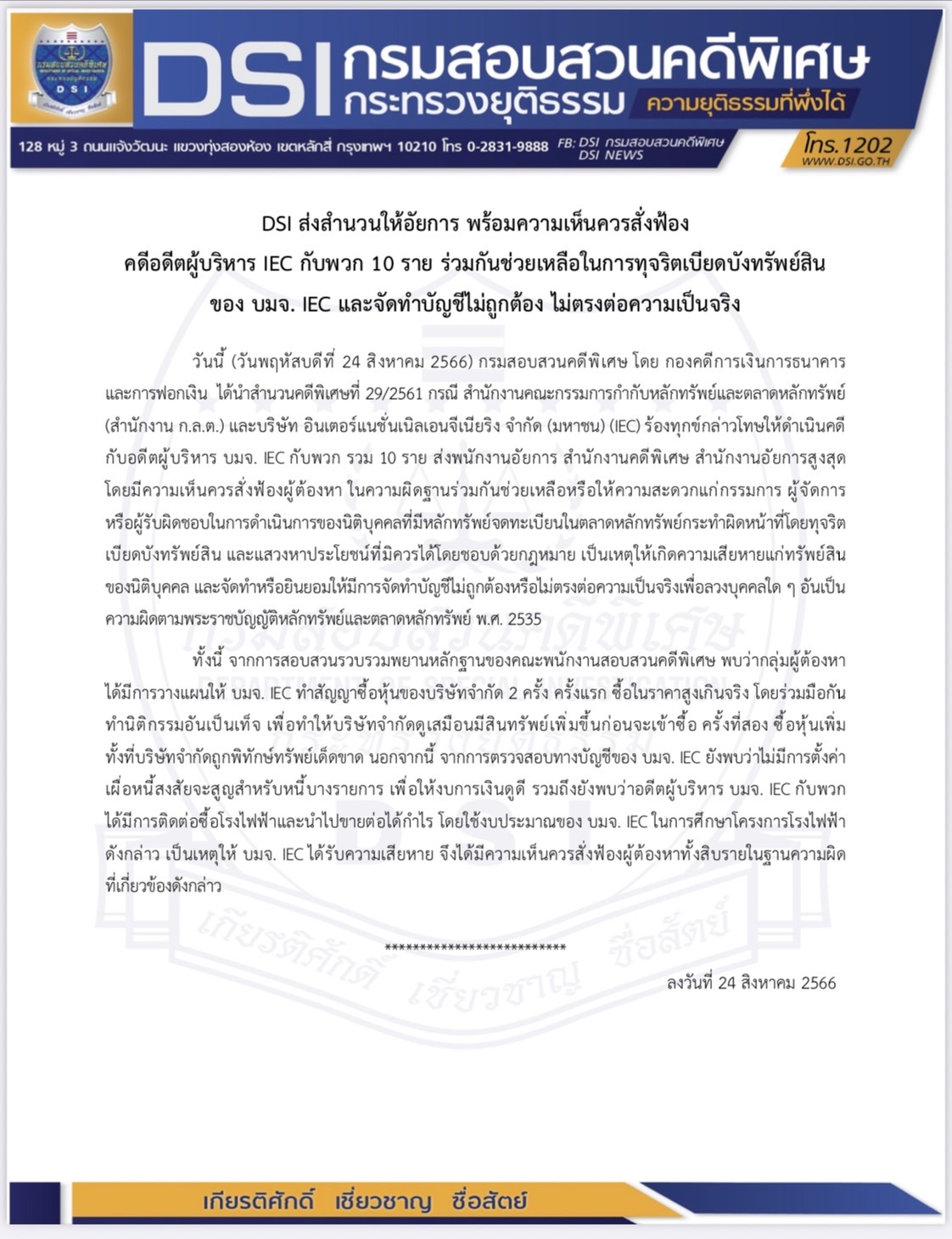 วันนี้ (วันพฤหัสบดีที่ 24 สิงหาคม 2566) กรมสอบสวนคดีพิเศษ โดย กองคดีการเงินการธนาคารและการฟอกเงิน ได้นำสำนวนคดีพิเศษที่ 29/2561 กรณี สำนักงานคณะกรรมการกำกับหลักทรัพย์และตลาดหลักทรัพย์ (สำนักงาน ก.ล.ต.) และบริษัท อินเตอร์แนชั่นเนิลเอนจีเนียริง จำกัด (มหาชน) (IEC) ร้องทุกข์กล่าวโทษให้ดำเนินคดีกับอดีตผู้บริหาร บมจ. IEC กับพวก รวม 10 ราย ส่งพนักงานอัยการ สำนักงานคดีพิเศษ สำนักงานอัยการสูงสุด