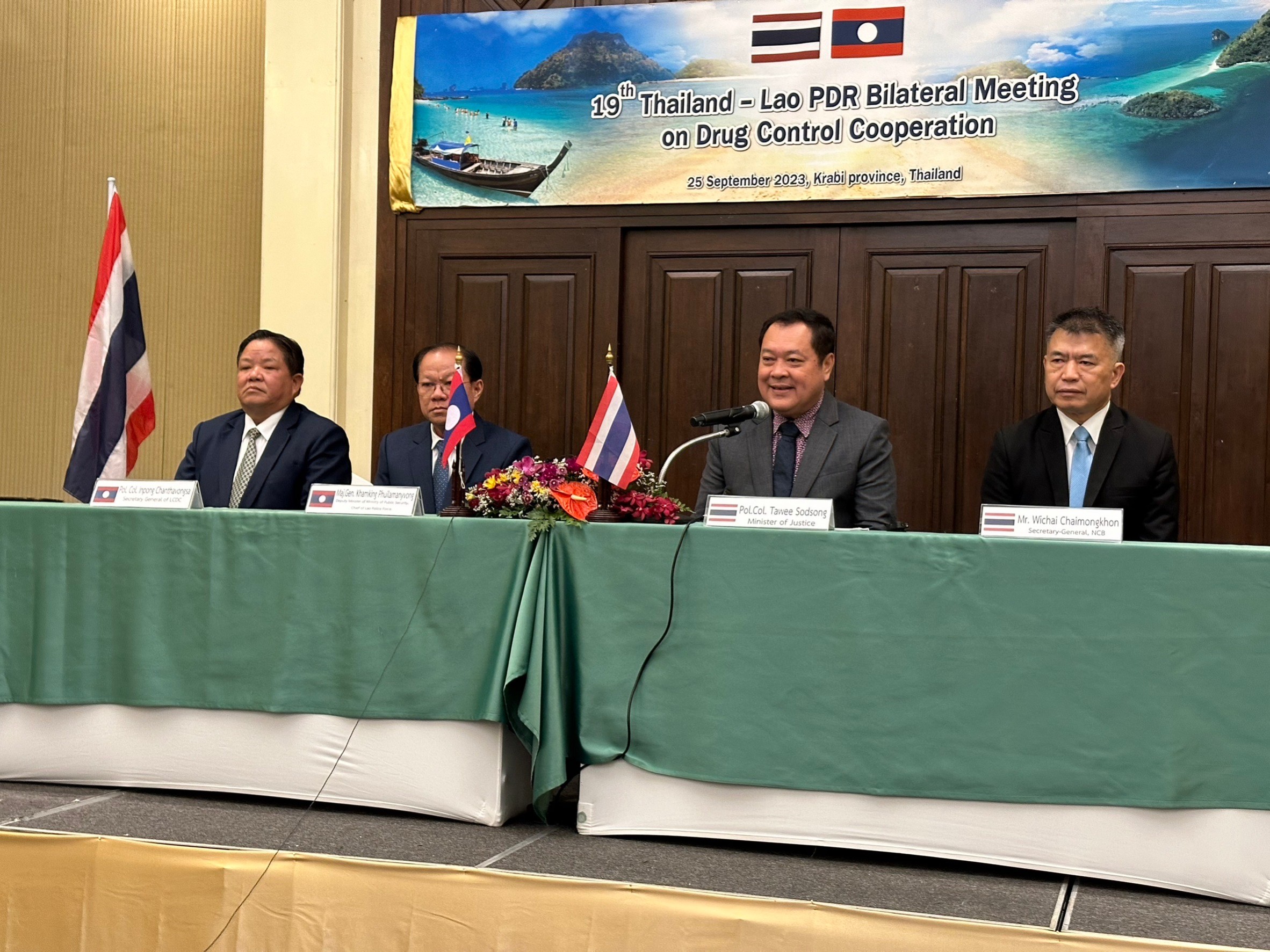 (วันจันทร์ที่ 25 กันยายน พ.ศ. 2566) ณ จังหวัดกระบี่ พ.ต.อ. ทวี สอดส่อง รัฐมนตรีว่าการกระทรวงยุติธรรม นำคณะผู้แทนไทย ประชุมทวิภาคไทย-ลาว เรื่องความร่วมมือด้านการป้องกันและปราบปรามยาเสพติด ครั้งที่ 19 โดยมี พลตรี คำกิ่ง ผุยหล้ามะนีวง รองรัฐมนตรีกระทรวงป้องกันความสงบ และหัวหน้ากรมใหญ่ตำรวจ เป็นหัวหน้าคณะผู้แทน สปป.ลาว พร้อมด้วยนายวิชัย ไชยมงคล เลขาธิการ ป.ป.ส. นายมานะ ศิริพิทยาวัฒน์ รองเลขาธิการ ป.ป.ส. พันเอก อินปง จันทะวงสา เลขาธิการคณะกรรมการแห่งชาติเพื่อตรวจตราและควบคุมยาเสพติด สปป.ลาว คณะผู้บริหารจากไทยและ สปป.ลาว เข้าร่วมการประชุม