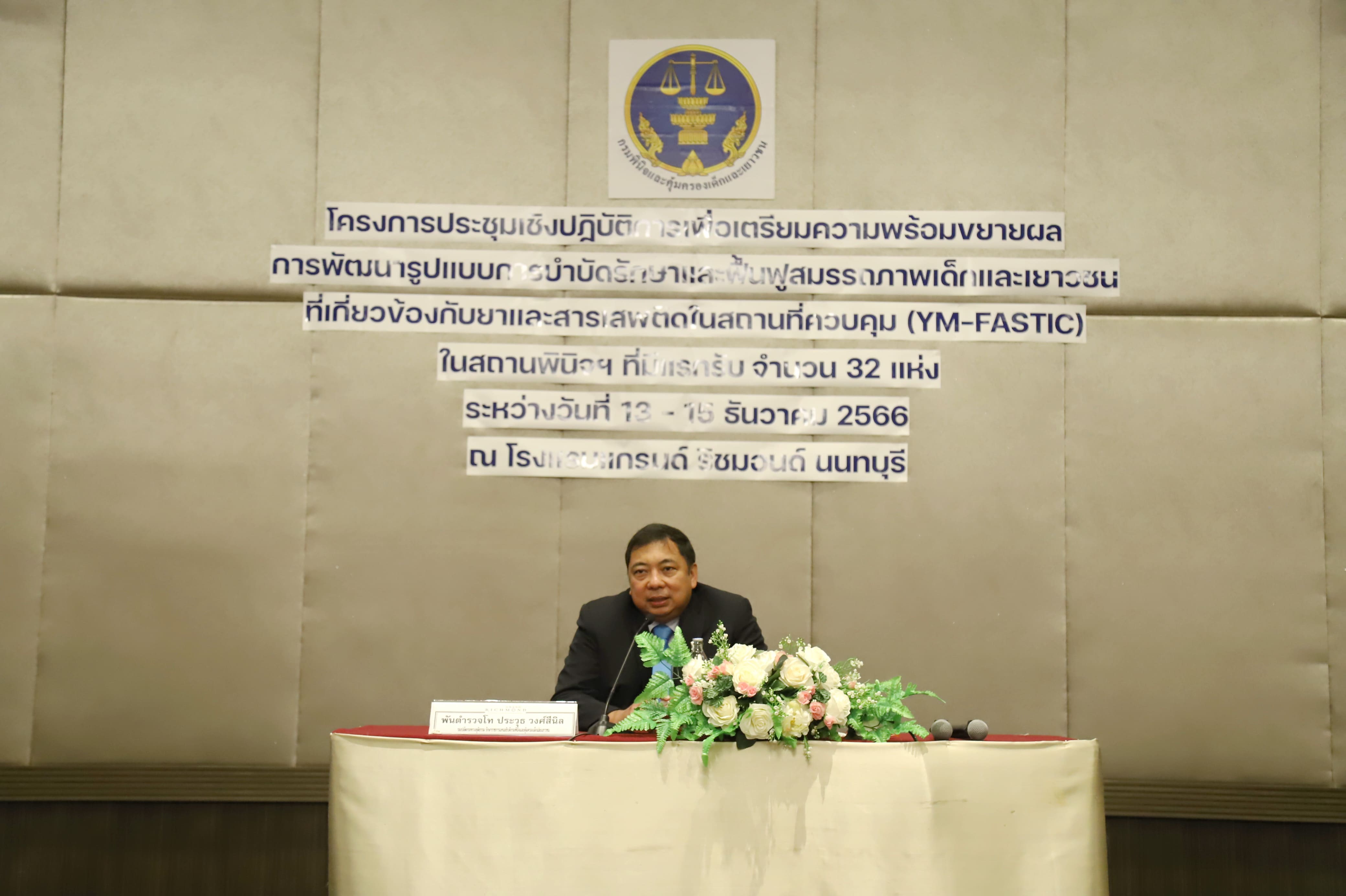 วันที่ 13 ธันวาคม 2566 เวลา 09.00 น. ณ โรงแรมแกรนด์ริชมอนด์ จังหวัดนนทบุรี พ.ต.อ.ทวี สอดส่อง รัฐมนตรีว่าการกระทรวงยุติธรรม เป็นประธานเปิด “การประชุมเชิงปฏิบัติการเพื่อเตรียมความพร้อมขยายผลการพัฒนารูปแบบการบำบัดรักษาและฟื้นฟูสมรรถภาพเด็กและเยาวชนที่เกี่ยวข้องกับยาและสารเสพติดในสถานที่ควบคุม (YM-FASTIC) ในสถานพินิจฯ ที่มีแรกรับ จำนวน 32 แห่ง” พร้อมมอบนโยบายด้านการบำบัดรักษาและฟื้นฟูผู้ติดยาเสพติดของกระทรวงยุติธรรม ในหัวข้อ “การจัดการปัญหายาเสพติดการสร้างภูมิคุ้มกันด้านยาเสพติดทุกรูปแบบให้เด็กและเยาวชน และการบำบัดรักษาผู้ติดยาเสพติดอย่างเหมาะสม”