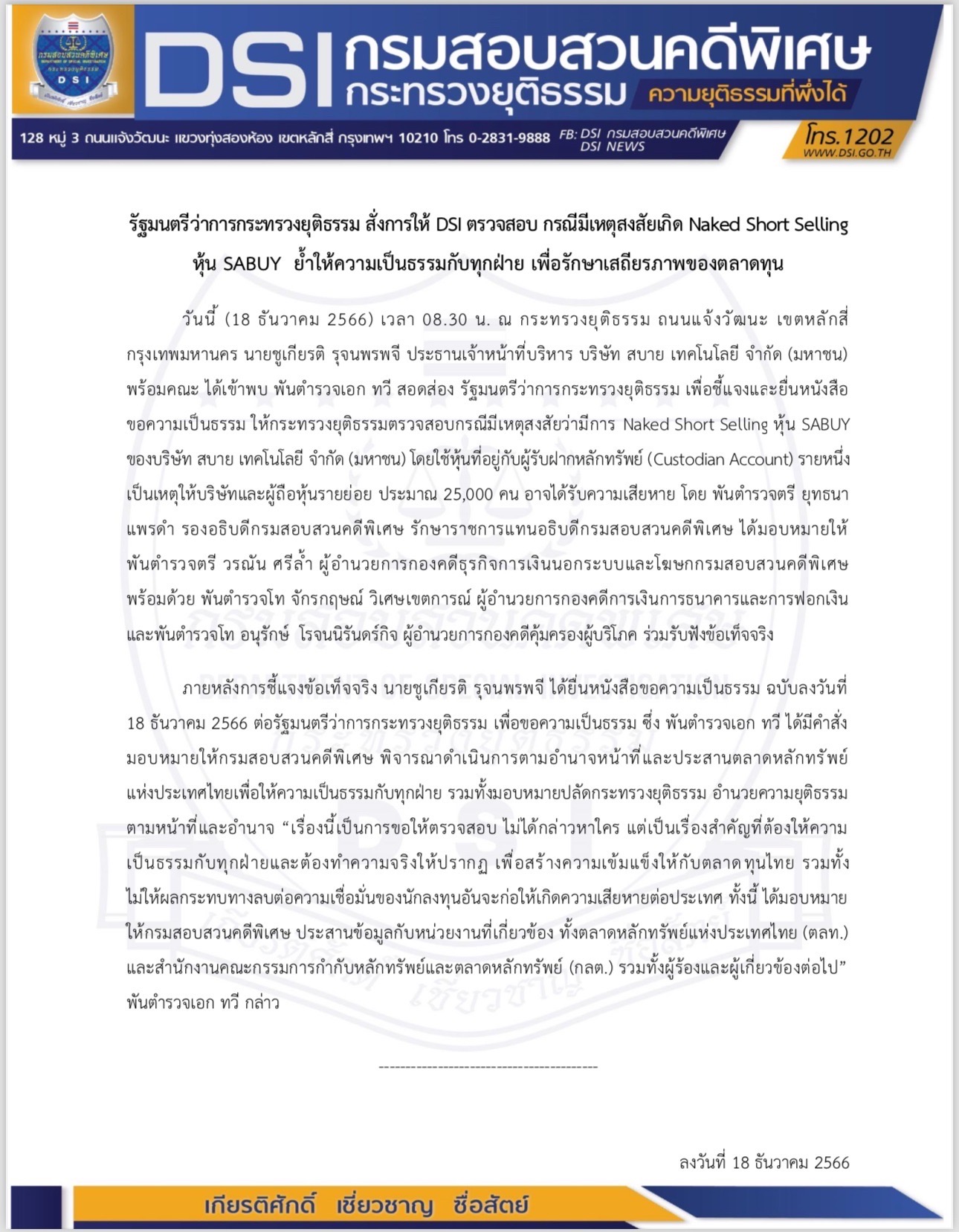 วันนี้ (18 ธันวาคม 2566) เวลา 08.30 น. ณ กระทรวงยุติธรรม ถนนแจ้งวัฒนะ เขตหลักสี่ กรุงเทพมหานคร นายชูเกียรติ รุจนพรพจี ประธานเจ้าหน้าที่บริหาร บริษัท สบาย เทคโนโลยี จำกัด (มหาชน) พร้อมคณะ ได้เข้าพบ พันตำรวจเอก ทวี สอดส่อง รัฐมนตรีว่าการกระทรวงยุติธรรม เพื่อชี้แจงและยื่นหนังสือขอความเป็นธรรม ให้กระทรวงยุติธรรมตรวจสอบกรณีมีเหตุสงสัยว่ามีการ Naked Short Selling หุ้น SABUY ของบริษัท สบาย เทคโนโลยี จำกัด (มหาชน) โดยใช้หุ้นที่อยู่กับผู้รับฝากหลักทรัพย์ (Custodian Account) รายหนึ่ง เป็นเหตุให้บริษัทและผู้ถือหุ้นรายย่อย ประมาณ 25,000 คน อาจได้รับความเสียหาย โดย พันตำรวจตรี ยุทธนา แพรดำ รองอธิบดีกรมสอบสวนคดีพิเศษ รักษาราชการแทนอธิบดีกรมสอบสวนคดีพิเศษ ได้มอบหมายให้ พันตำรวจตรี วรณัน ศรีล้ำ ผู้อำนวยการกองคดีธุรกิจการเงินนอกระบบและโฆษกกรมสอบสวนคดีพิเศษ
