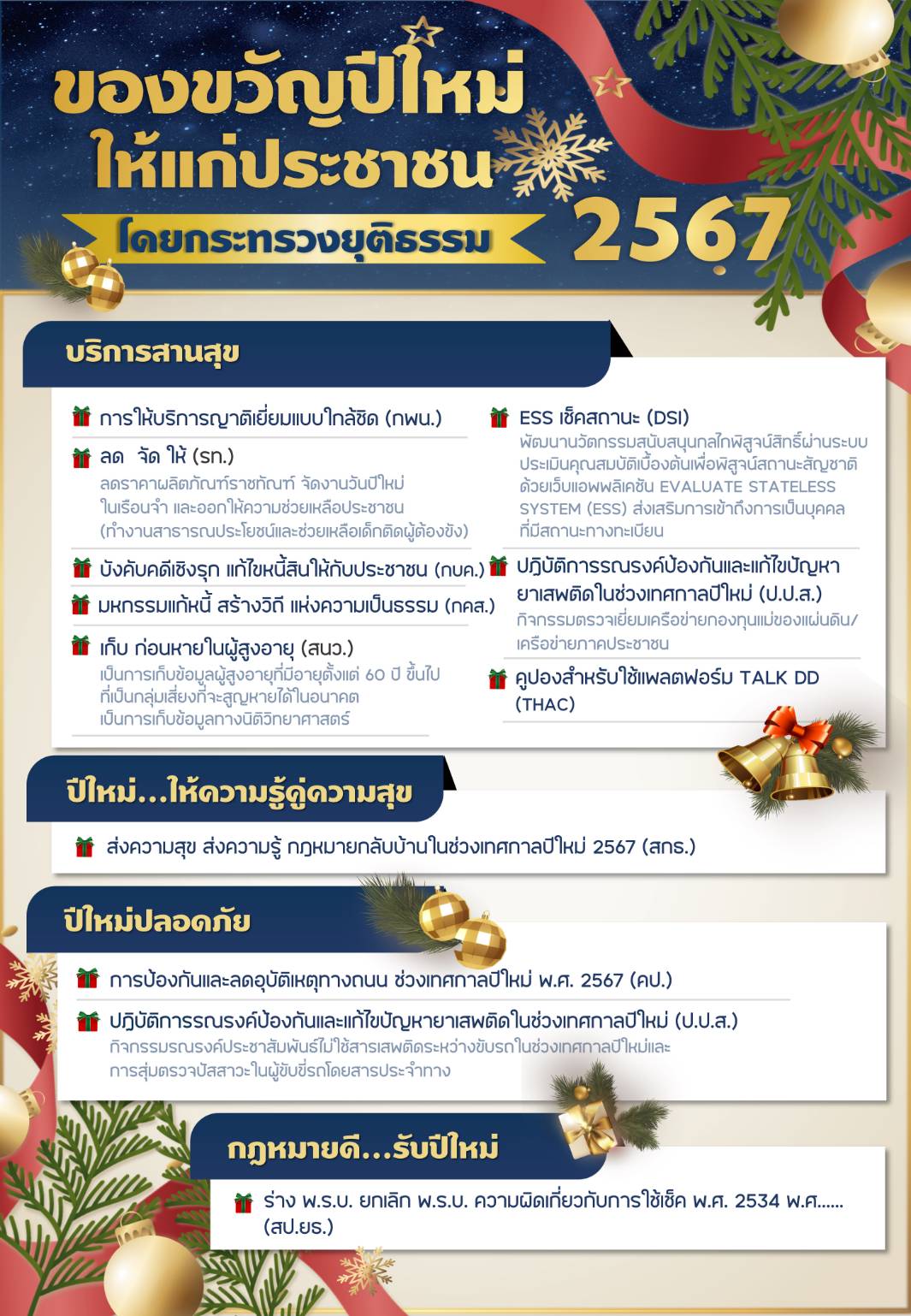 1. บริการสานสุข จำนวน 8 รายการ ประกอบด้วย 1.1 การให้บริการญาติเยี่ยมแบบใกล้ชิด โดย กรมพินิจและคุ้มครองเด็กและเยาวชน 1.2 ลด จัด ให้ ลดราคาผลิตภัณฑ์ราชทัณฑ์ จัดงานวันปีใหม่ในเรือนจำ และออกให้ความช่วยเหลือประชาชน (ทำงานสาธารณประโยชน์และช่วยเหลือเด็กติดผู้ต้องขัง) 1.3 บังคับคดีเชิงรุก แก้ไขหนี้สินให้กับประชาชน โดยกรมบังคับคดี 1.4 มหกรรมแก้หนี้ สร้างวิถี แห่งความเป็นธรรม โดยกรมคุ้มครองสิทธิและเสรีภาพ 1.5 เก็บ ก่อนหายในผู้สูงอายุ โดย สถาบันนิติวิทยาศาสตร์ เป็นการเก็บข้อมูลทางนิติวิทยาศาสตร์ สำหรับผู้สูงอายุที่มีอายุตั้งแต่ 60 ปี ขึ้นไป ที่เป็นกลุ่มเสี่ยงที่จะสูญหายได้ในอนาคต 1.6 ESS เช็คสถานะ โดยกรมสอบสวนคดีพิเศษ การพัฒนานวัตกรรมสนับสนุนกลไกพิสูจน์สิทธิ์ผ่านระบบประเมินคุณสมบัติเบื้องต้นเพื่อพิสูจน์สถานะสัญชาติด้วยเว็บแอปพลิเคชัน EVALUATE STATELESS SYSTEM (ESS) ส่งเสริมการเข้าถึงการเป็นบุคคลที่มีสถานะทางทะเบียน 1.7 ปฏิบัติการรณรงค์ป้องกันและแก้ไขปัญหายาเสพติดในช่วงเทศกาลปีใหม่ โดย สำนักงาน ป.ป.ส. กิจกรรมตรวจเยี่ยมเครือข่ายกองทุนแม่ของแผ่นดิน/เครือข่ายภาคประชาชน และ 1.8 คูปองสำหรับแพลตฟอร์ม TALK DD โดย สถาบันอนุญาโตตุลาการ (Thailand Arbitration Center: THAC)