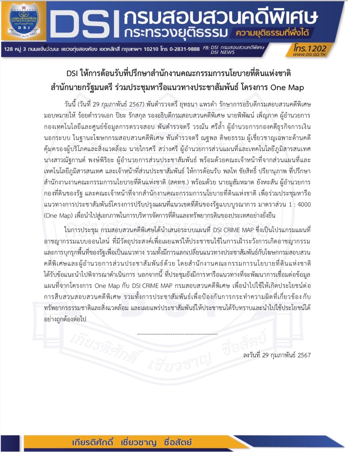 ในการประชุม กรมสอบสวนคดีพิเศษได้นำเสนอระบบแผนที่ DSI CRIME MAP ซึ่งเป็นโปรแกรมแผนที่อาชญากรรมแบบออนไลน์ ที่มีวัตถุประสงค์เพื่อเผยแพร่ให้ประชาชนใช้ในการเฝ้าระวังการเกิดอาชญากรรมและการบุกรุกพื้นที่ของรัฐเพื่อเป็นแนวทาง รวมทั้งมีการแลกเปลี่ยนแนวทางประชาสัมพันธ์กับโฆษกกรมสอบสวน คดีพิเศษและผู้อำนวยการส่วนประชาสัมพันธ์ด้วย โดยสำนักงานคณะกรรมการนโยบายที่ดินแห่งชาติได้รับข้อแนะนำไปพิจารณาดำเนินการ นอกจากนี้ ที่ประชุมยังมีการหารือแนวทางที่จะพัฒนาการเชื่อมต่อข้อมูลแผนที่จากโครงการ One Map กับ DSI CRIME MAP กรมสอบสวนคดีพิเศษ เพื่อนำไปใช้ให้เกิดประโยชน์ต่อการสืบสวนสอบสวนคดีพิเศษ รวมทั้งการประชาสัมพันธ์เพื่อป้องกันการกระทำความผิดที่เกี่ยวข้องกับทรัพยากรธรรมชาติและสิ่งแวดล้อม และเผยแพร่ประชาสัมพันธ์ให้ประชาชนได้รับทราบและนำไปใช้ประโยชน์ได้อย่างถูกต้องต่อไป