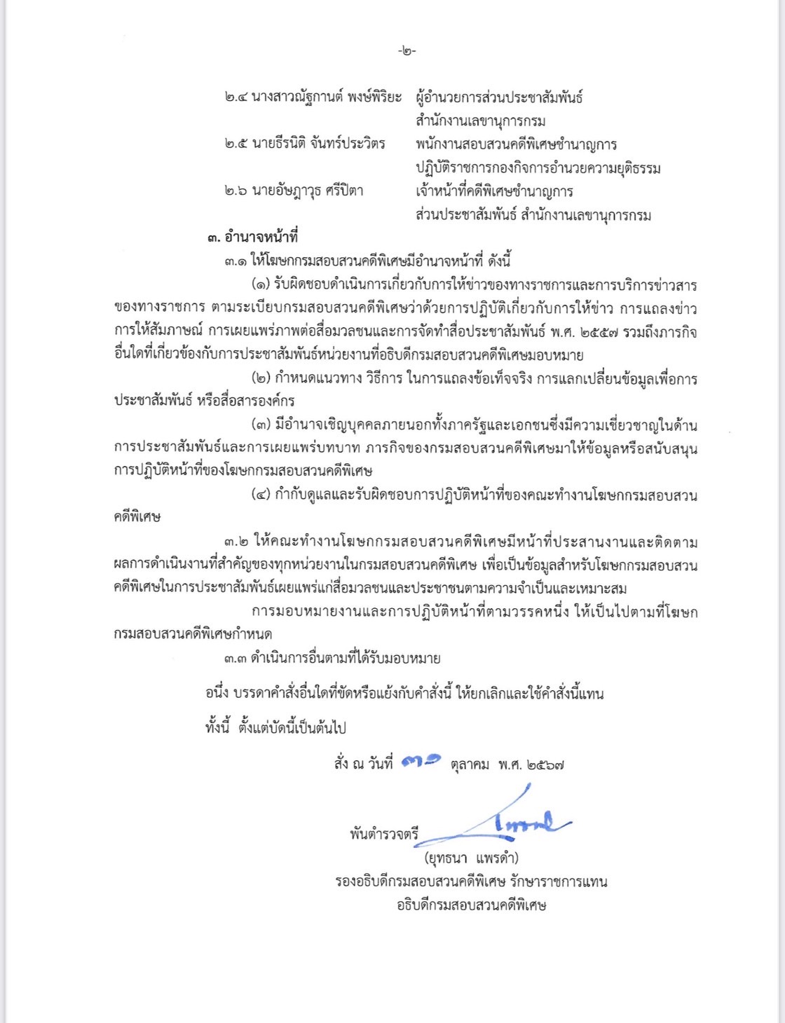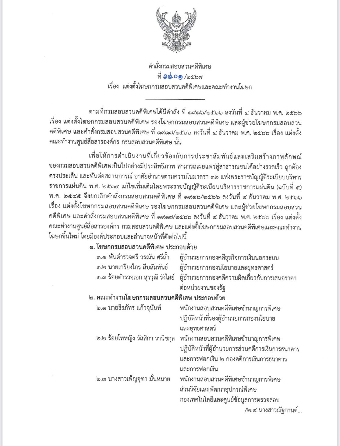 เมื่อวันที่ 30 ตุลาคม 2567 นี้ พ.ต.ต.ยุทธนา แพรดำ ว่าที่อธิบดีกรมสอบสวนคดีพิเศษ ได้ลงนามแต่งตั้งคณะทำงานศูนย์สื่อสารองค์กร กรมสอบสวนคดีพิเศษ และ แต่งตั้งโฆษกกรมสอบสวนคดีพิเศษและคณะทำงานโฆษกขึ้นใหม่ โดยมีองค์ประกอบและอำนาจหน้าที่ ดังต่อไปนี้ โฆษกกรมสอบสวนคดีพิเศษ ประกอบด้วยพันตำรวจตรี วรณัน ศรีล้ำ ผู้อำนวยการกองคดีธุรกิจการเงินนอกระบบ นายเกรียงไกร สืบสัมพันธ์ ผู้อำนวยการกองนโยบายและยุทธศาสตร์ ร้อยตำรวจเอก สุรวุฒิ รังไสย์ ผู้อำนวยการกองคดีความผิดเกี่ยวกับการเสนอราคาต่อหน่วยงานของรัฐ คณะทำงานโฆษกกรมสอบสวนคดีพิเศษ ประกอบด้วย นายธีรภัทร แก้วจุนันท์ พนักงานสอบสวนคดีพิเศษชำนาญการพิเศษ ปฏิบัติหน้าที่รองผู้อำนวยการกองนโยบายและยุทธศาสตร์ ร้อยโทหญิง วัสสิกา วานิชกุล พนักงานสอบสวนคดีพิเศษชำนาญการพิเศษปฏิบัติหน้าที่ผู้อำนวยการส่วนคดีการเงินการธนาคาร และการฟอกเงิน กองคดีการเงินการธนาคาร และการฟอกเงิน นางสาวเพ็ญจุฑา มั่นหมาย พนักงานสอบสวนคดีพิเศษชำนาญการพิเศษ ส่วนวิจัยและพัฒนาอุปกรณ์พิเศษกองเทคโนโลยีและศูนย์ข้อมูลการตรวจสอบ นางสาวณัฐกานต์ พงษ์พิริยะ ผู้อำนวยการส่วนประชาสัมพันธ์ สำนักงานเลขานุการกรม นายธีรนิติ จันทร์ประวิตร พนักงานสอบสวนคดีพิเศษชำนาญการ ปฏิบัติราชการกองกิจการอำนวยความยุติธรรม นายอัษฎาวุธ ศรีปิตา เจ้าหน้าที่คดีพิเศษชำนาญการ ส่วนประชาสัมพันธ์ สำนักงานเลขานุการกรม