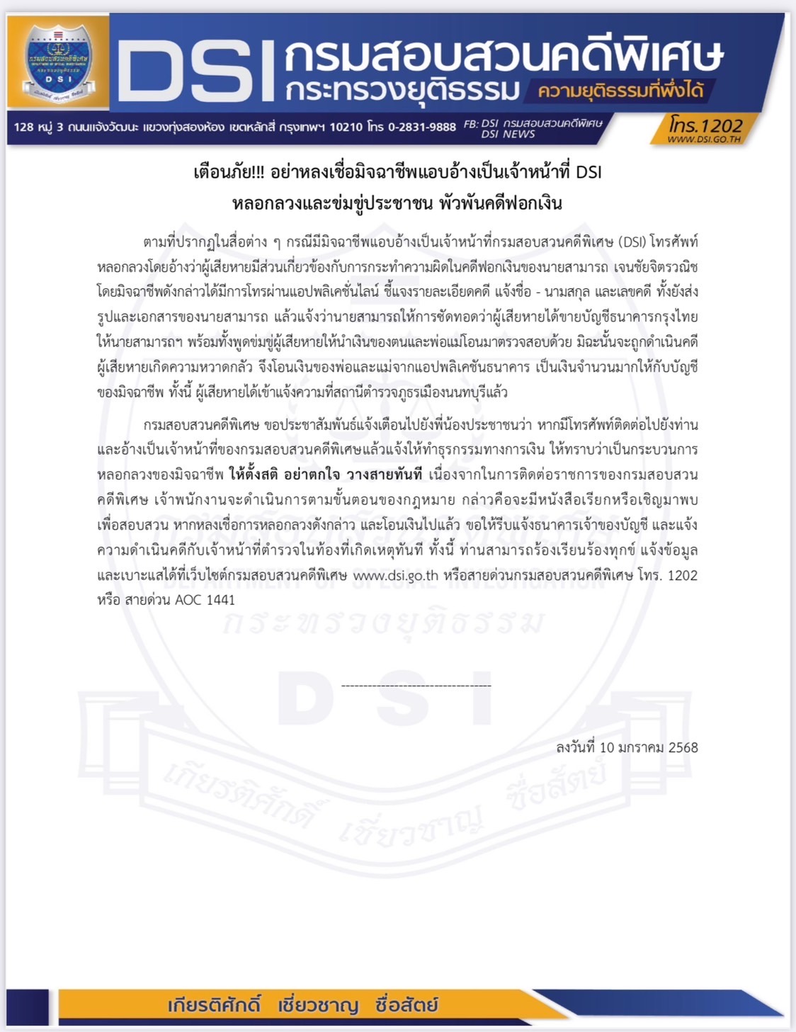 กรมสอบสวนคดีพิเศษ ขอประชาสัมพันธ์แจ้งเตือนไปยังพี่น้องประชาชนว่า หากมีโทรศัพท์ติดต่อไปยังท่านและอ้างเป็นเจ้าหน้าที่ของกรมสอบสวนคดีพิเศษแล้วแจ้งให้ทำธุรกรรมทางการเงินให้ทราบว่าเป็นกระบวนการหลอกลวงของมิจฉาชีพ ให้ตั้งสติ อย่าตกใจ วางสายทันที เนื่องจากในการติดต่อราชการของกรมสอบสวน