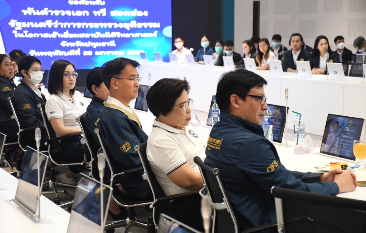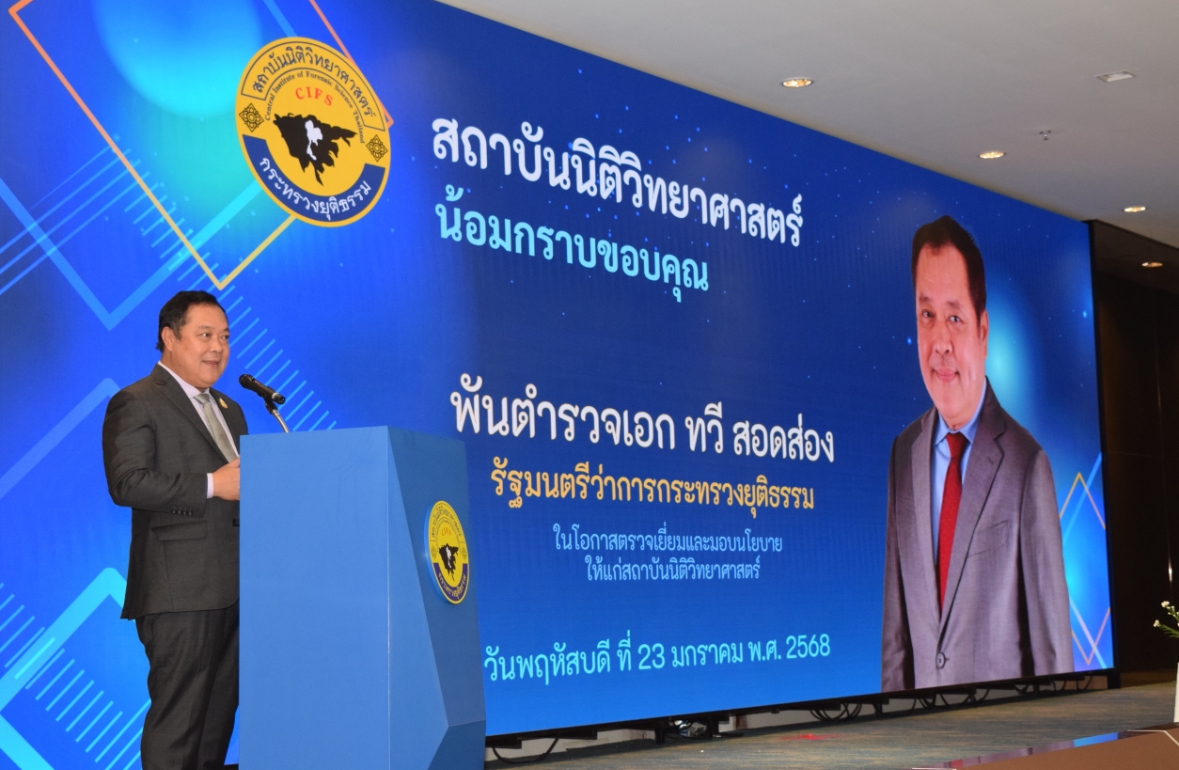 โดยรัฐมนตรีว่าการกระทรวงยุติธรรม กล่าวใจความสำคัญตอนหนึ่งว่า สถาบันนิติวิทยาศาสตร์ เป็นหน่วยงานที่มีบทบาทสำคัญในการให้บริการตรวจพิสูจน์หลักฐานด้านต่างๆ ทางนิติวิทยาศาสตร์ เพื่อประกอบการพิจารณาคดี รวมถึงสนับสนุน ส่งเสริม และอำนวยการในกระบวนการยุติธรรมของประเทศไทย จึงถือเป็นหน่วยงานสำคัญหน่วยงานหนึ่งในกระบวนการยุติธรรมทางอาญา และทางแพ่ง ถือเป็นทางออกของการยกระดับหลักนิติธรรมของประเทศไทย ด้วยความโปร่งใส เที่ยงธรรม เชื่อถือได้ เป็นที่ยอมรับในระดับสากล ซึ่งที่ผ่านมาสถาบันนิติวิทยาศาสตร์ ได้มีผลงานที่สำคัญทั้งด้านการให้บริการและการตรวจพิสูจน์ คนหาย คนนิรนาม ปละศพนิรนาม ตามที่ประเทศไทยซึ่งเป็นประเทศแรกในอาเซียนที่บังคับใช้พระราชบัญญัติป้องกันและปราบปราม การทรมานและการกระทำให้บุคคลสูญหาย พ.ศ. 2565 รวมถึงการยกระดับความเป็นเลิศในการตรวจพิสูจน์สารเสพติดในเส้นผมผู้กระทำความผิด