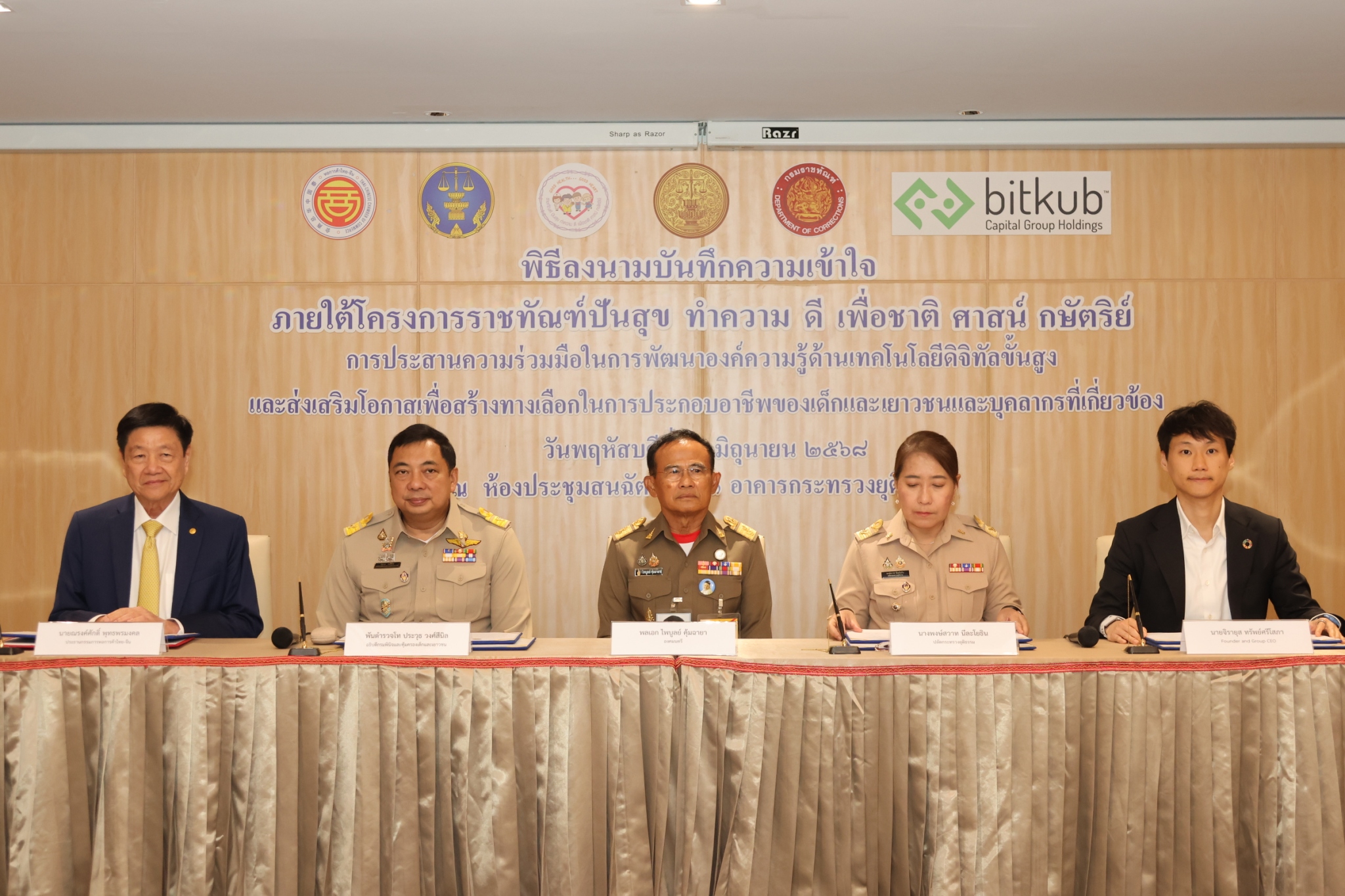 วันนี้ (พฤหัสบดีที่ 12 มิถุนายน 2568) เวลา 13.30 น. พลเอก ไพบูลย์ คุ้มฉายา องคมนตรี รองประธานคณะกรรมการมูลนิธิราชทัณฑ์ปันสุข ทำความ ดี เพื่อชาติ ศาสน์ กษัตริย์ เป็นประธานสักขีพยานในพิธีลงนามบันทึกความเข้าใจ “การประสานความร่วมมือในการพัฒนาองค์ความรู้ด้านเทคโนโลยีดิจิทัลขั้นสูง และส่งเสริมโอกาสเพื่อสร้างทางเลือกในการประกอบอาชีพ” ภายใต้โครงการราชทัณฑ์ปันสุข ทำความ ดี เพื่อชาติ ศาสน์ กษัตริย์ ระหว่าง กระทรวงยุติธรรม กับ บริษัท บิทคับ แคปปิตอล กรุ๊ป โฮลดิ้งส์ จำกัด และระหว่างกรมพินิจและคุ้มครองเด็กและเยาวชน กับหอการค้าไทย – จีน ทั้งนี้ได้รับเกียรติจาก พันตำรวจเอก ทวี สอดส่อง รัฐมนตรีว่าการกระทรวงยุติธรรม ร่วมเป็นเกียรติในพิธีลงนามฯ โดยมี นางพงษ์สวาท นีละโยธิน ปลัดกระทรวงยุติธรรม พร้อมด้วย พันตำรวจโท ประวุธ วงศ์สีนิล อธิบดีกรมพินิจและคุ้มครองเด็กและเยาวชน นายจิรายุส ทรัพย์ศรีโสภา ผู้ก่อตั้งและประธานเจ้าหน้าที่บริหาร บริษัท บิทคับ แคปปิตอล กรุ๊ป โฮลดิ้งส์ จำกัด และนายณรงค์ศักดิ์ พุทธพรมงคล ประธานกรรมการหอการค้าไทย - จีน ร่วมลงนามฯ โอกาสนี้ นางจิรภา สินธุนาวา รองปลัดกระทรวงยุติธรรม ในฐานะกรรมการและผู้ช่วยเลขาธิการมูลนิธิราชทัณฑ์ปันสุขฯ นายสหการณ์ เพ็ชรนรินทร์ อธิบดีกรมราชทัณฑ์ คณะผู้บริหาร ข้าราชการ และเจ้าหน้าที่ที่เกี่ยวข้องเข้าร่วมเป็นเกียรติในพิธีลงนามฯ ครั้งนี้ด้วย ณ ห้องประชุมสนฉัตร ชั้น 3 อาคารกระทรวงยุติธรรม ถนนแจ้งวัฒนะ เขตหลักสี่ กรุงเทพมหานคร