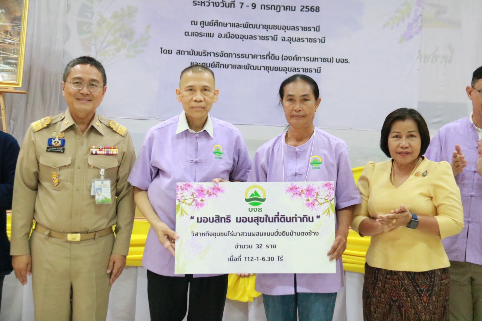 ขณะที่ร้อยตรี สรมงคล มงคละสิริ รองผู้ว่าราชการจังหวัดอุบลราชธานี เปิดเผยว่า ขอบคุณธนาคารที่ดิน โดยในปี 2568 ช่วยเหลือพี่น้องเกษตรกร 2 วิสาหกิจชุมชน คือ วิสาหกิจชุมชนพัฒนาเกษตรขามใหญ่ ต.หนองบก อ.เหล่าเสือโก้ก และวิสาหกิจชุมชนการเกษตรพอเพียง ต.จิกเทิง อ.ตาลสุม รวมจำนวนสมาชิก 47 ครัวเรือน พื้นที่กว่า 137 ไร่ และทราบว่า ในแผนปี 2569 มีแผนจัดสรรที่ดินให้แก่วิสาหกิจชุมชนบ้านไร่เปี่ยมสุข วาริน