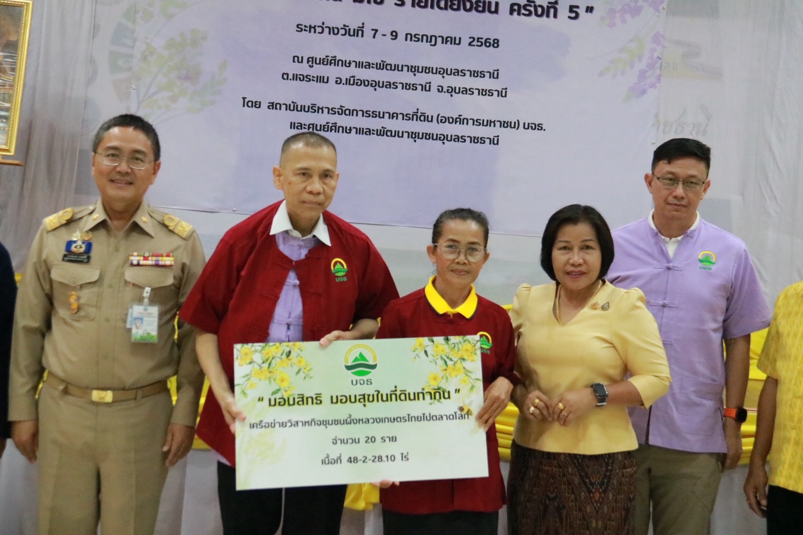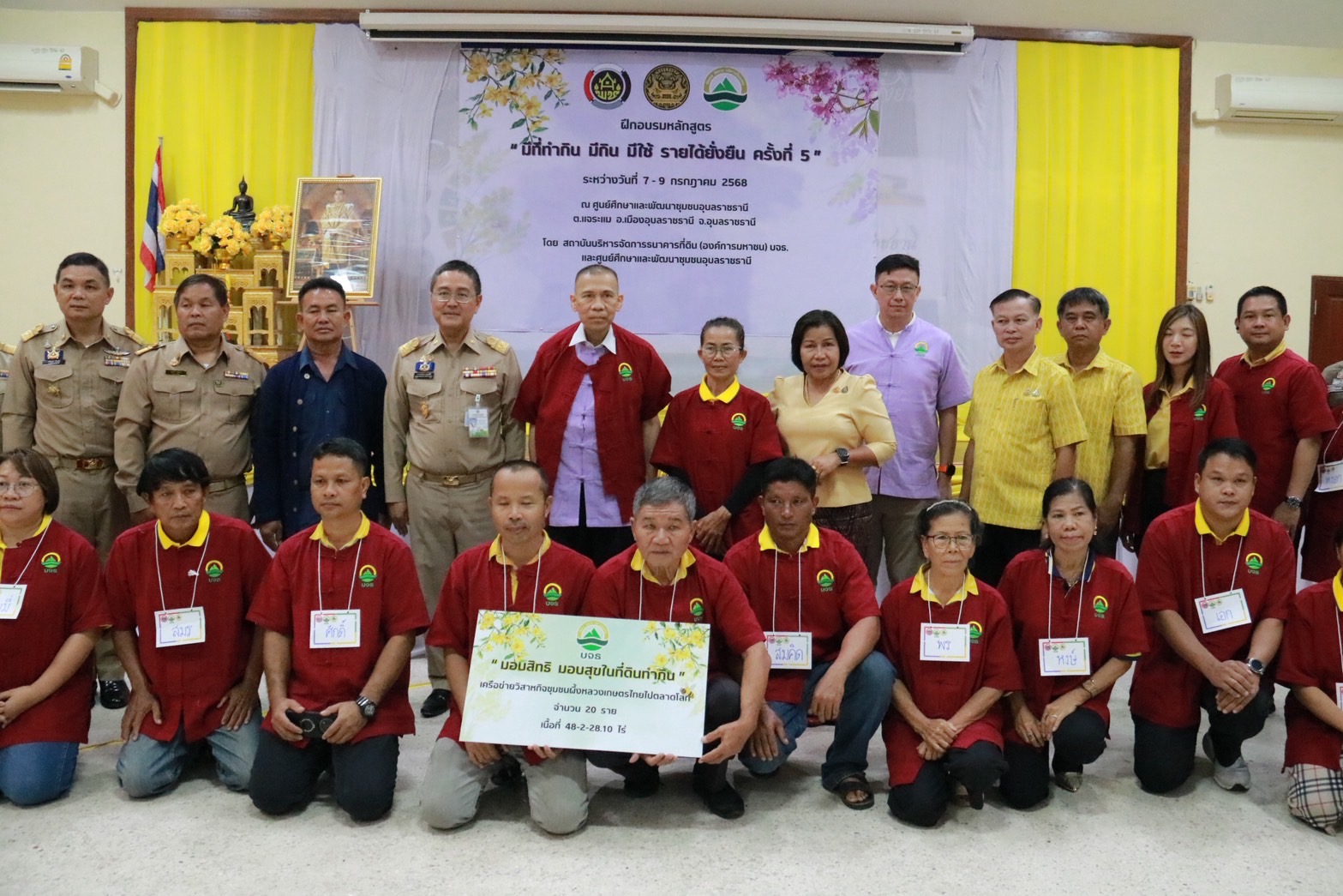 วันเดียวกันนี้ พล.ต.อ.เฉลิมเกียรติ ศรีวรขาน ประธานกรรมการ สถาบันบริหารจัดการธนาคารที่ดิน เปิดการฝึกอบรมหลักสูตร “มีที่ทำกิน มีกิน มีใช้ รายได้ยั่งยืน” และมอบสิทธิมอบสุขที่ดินให้เกษตรกร ครั้งที่ 5 จัดขึ้น ณ ศูนย์ศึกษาและพัฒนาชุมชนอุบลราชธานี อ.เมือง จ.อุบลราชธานี มีผู้เข้าอบรมจากวิสาหกิจชุมชนไร่นาสวนผสมแบบยั่งยืนบ้านดงช้าง ต.โนนสง่า อ.ปทุมรัตน์ จ.ร้อยเอ็ด จำนวน 32 ราย ได้รับจัดสรรที่ดินจาก 112 ไร่เศษ และกลุ่มเครือข่ายวิสาหกิจชุมชนผึ้งหลวงเกษตรไทยไปตลาดโลก ต.คำอาฮวน อ.เมือง จ.มุกดาหาร จำนวน 20 ราย ได้รับจัดสรรที่ดิน 48 ไร่