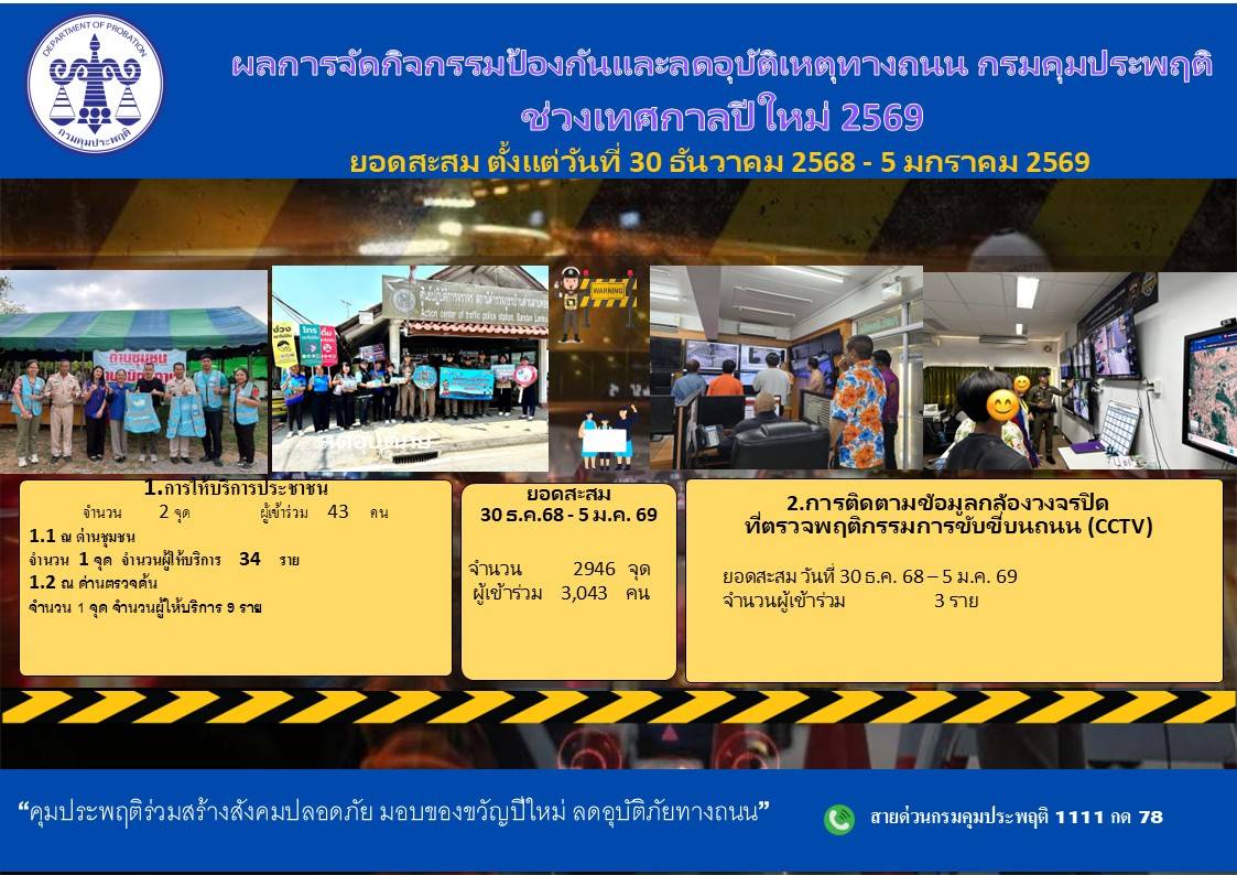วันนี้ (6 มกราคม 2569) ร้อยตำรวจเอก ปิยะ รักสกุล อธิบดีกรมคุมประพฤติ เปิดเผยถึงสรุปยอดคดีที่เข้าสู่กระบวนการคุมประพฤติในช่วง “7 วันควบคุมเข้มข้นปีใหม่ 2569” ประจำวันที่ 5 มกราคม 2569